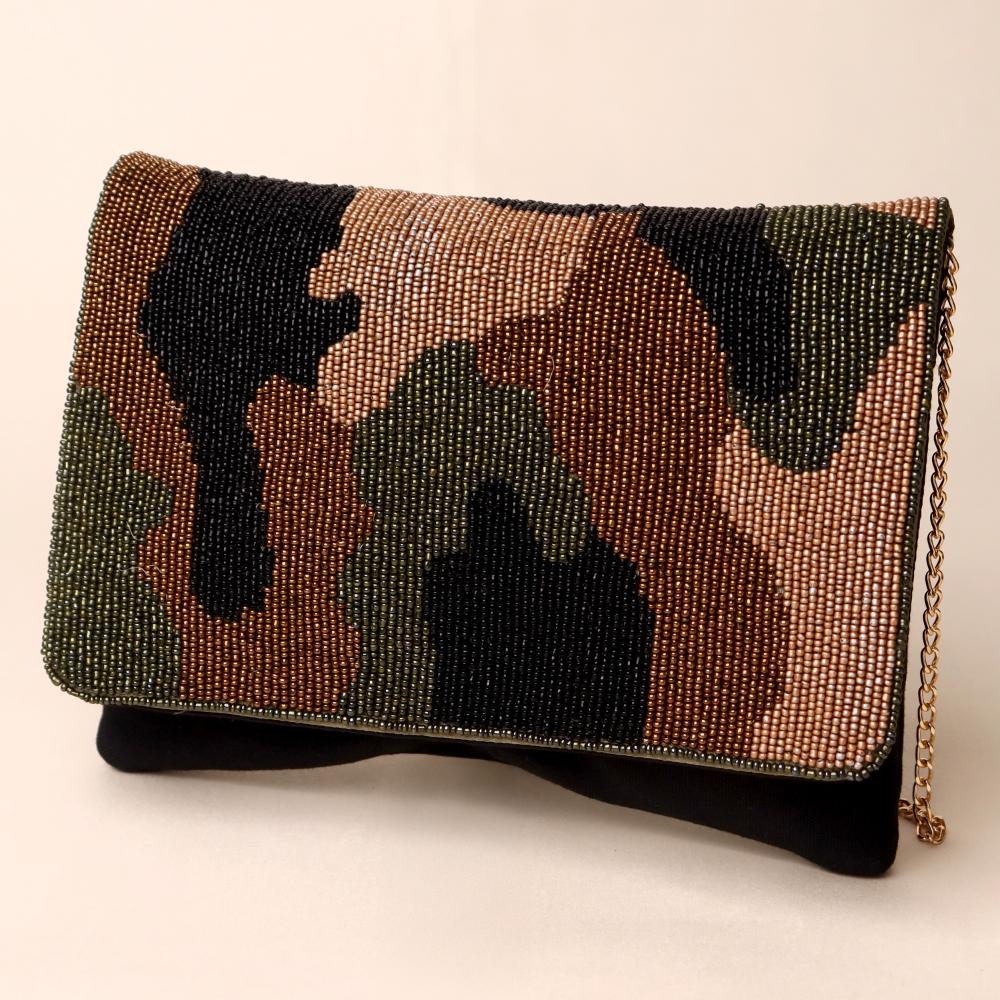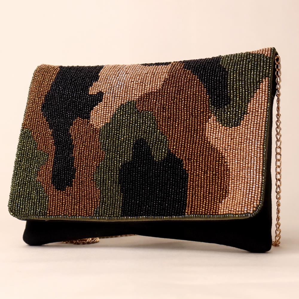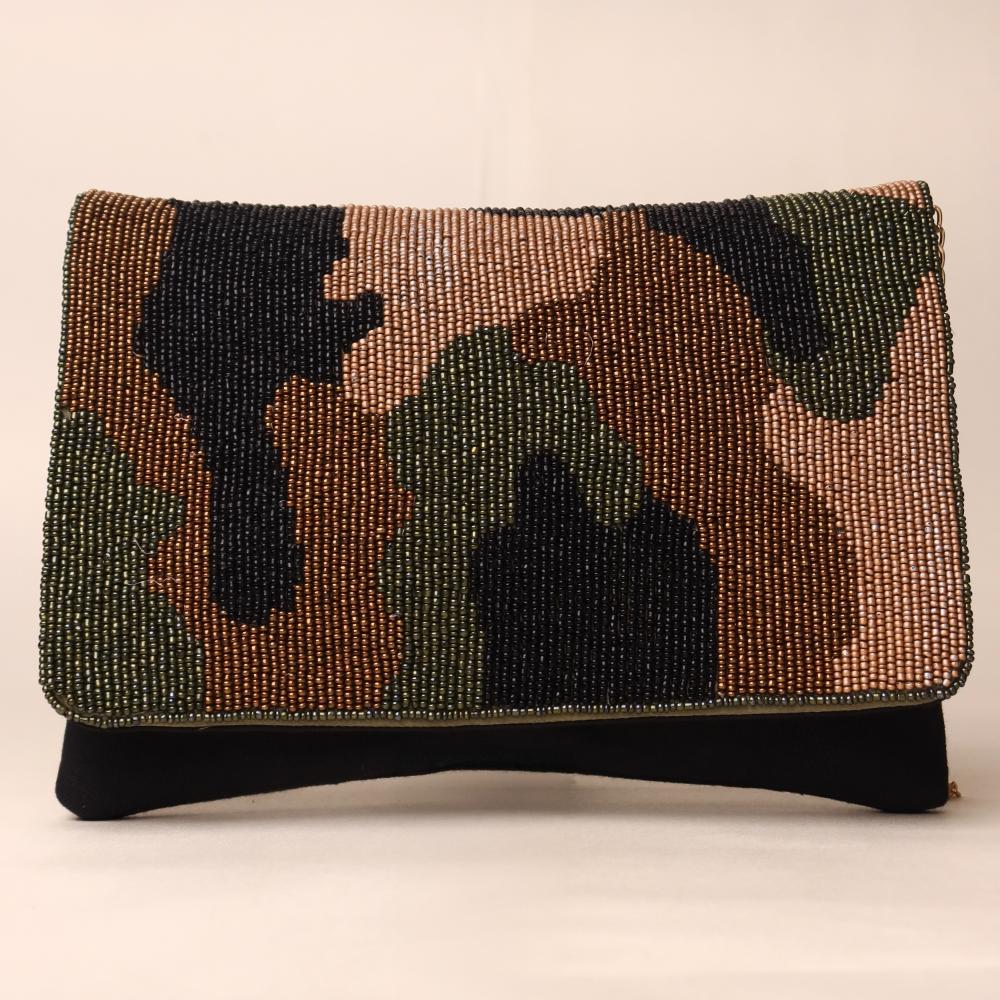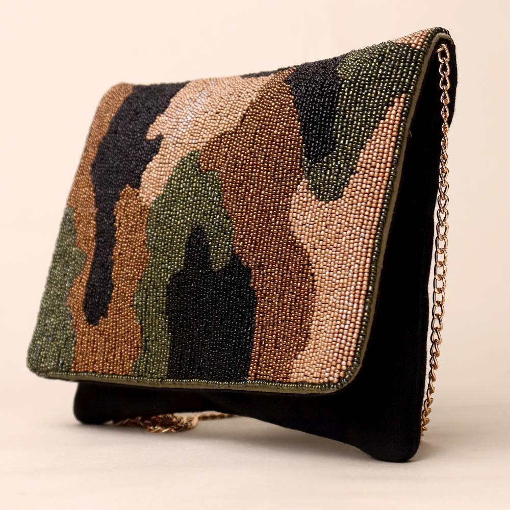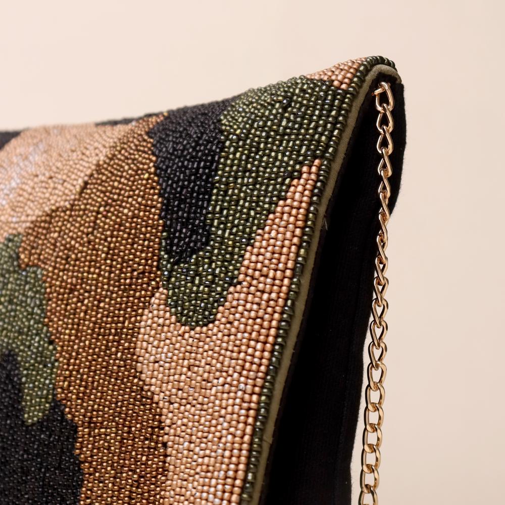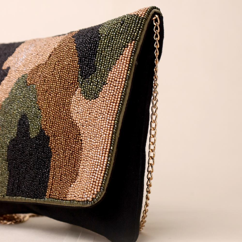 A bold blend of rugged style and refined craftsmanship, this hand-beaded sling bag brings a modern twist to the classic camouflage pattern. Designed with intricate beadwork in earthy tones of olive, bronze, black, and tan, it exudes effortless sophistication while maintaining a statement edge. The gold-tone chain strap allows versatile styling—wear it as a crossbody for hands-free ease or detach it to carry as a chic clutch. Perfect for casual evenings, travel, or adding a touch of urban glam to any outfit.