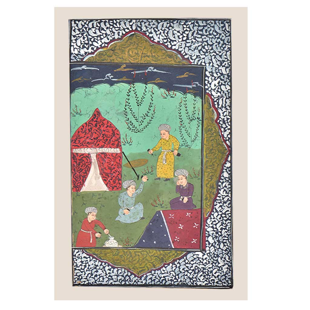 The mughal photo shows four prince camping in a forest at night . They are all busy cooking, serving drinks this was a common ritual of prince and they used to squander money on drinks, women and huting. An excellent home décor product.
