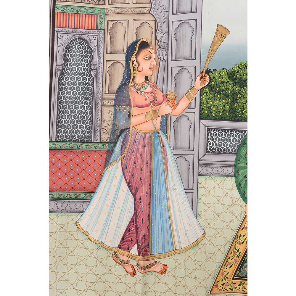 The emperor holds a glass filled with liquor and request Mumtaz to have a sip. The pair€™s royal status is indicated by the carpeted terrace overlooking a garden of flowering trees.