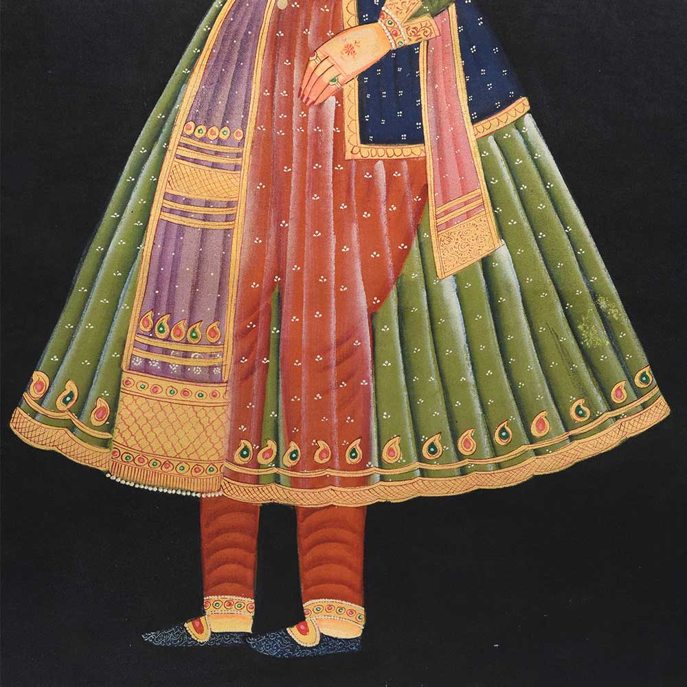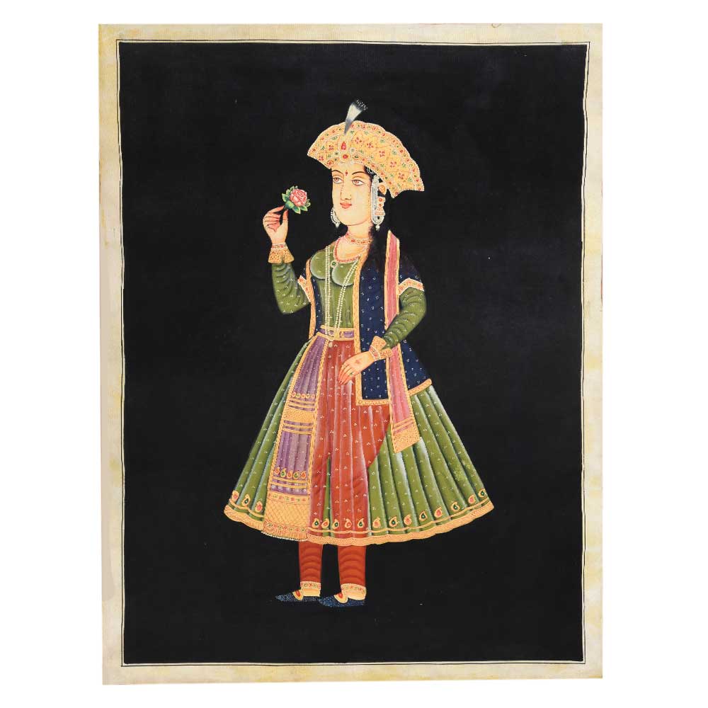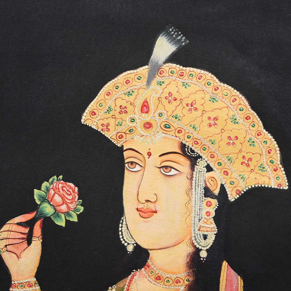 This is a traditional Mughal painting of Mumtaz Begum the chief consort of the Mughal emperor Shah Jahan. This Canvas painting has very fine details and is of very high quality.