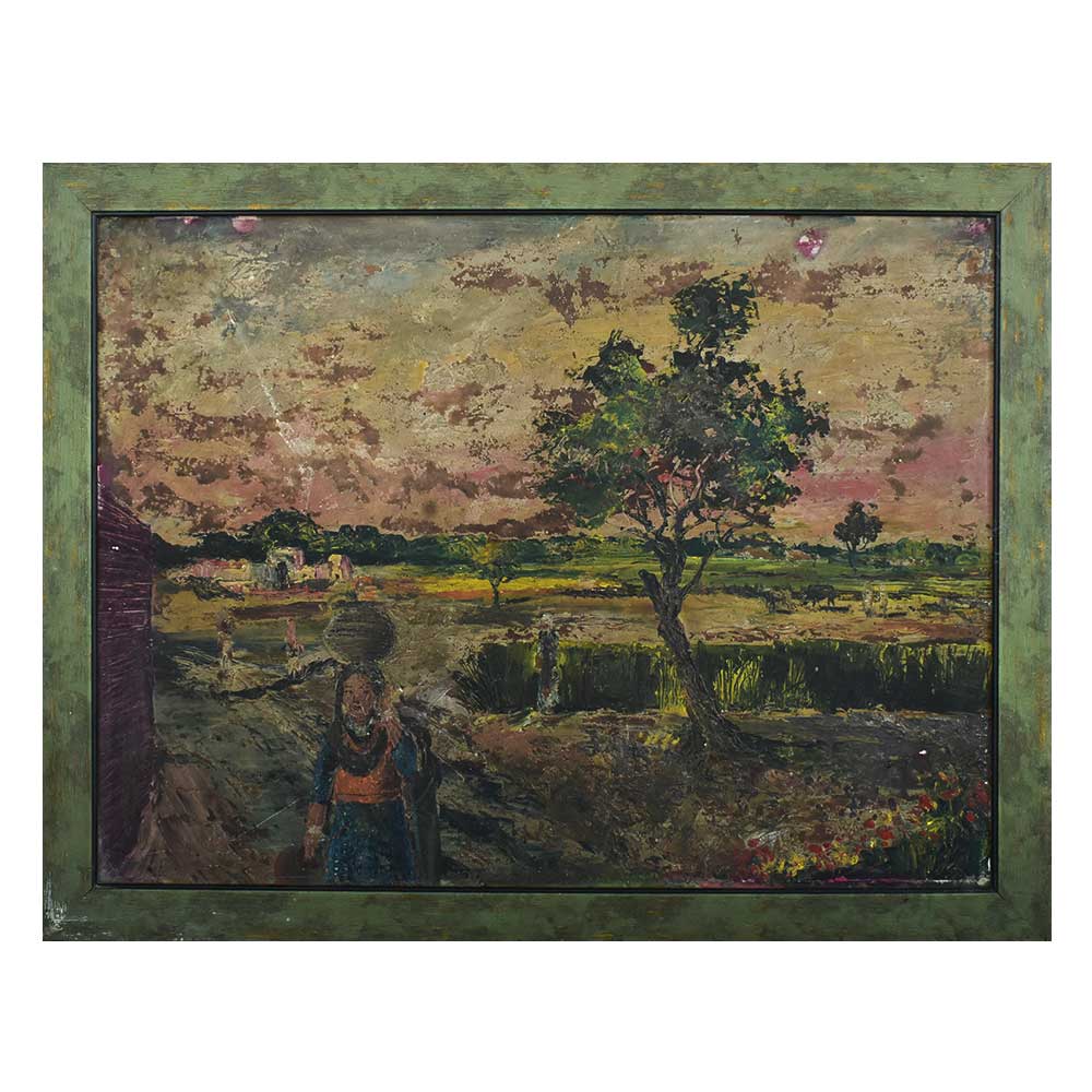 This lovely hand-painted canvas acrylic artwork depicts a peasant woman fetching water against a countryside setting. It's a great thing for hanging on the wall and can also be used as a new present item.