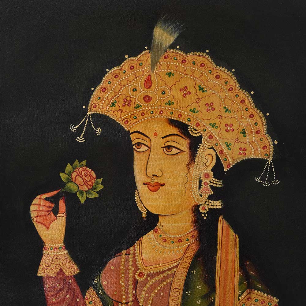 Traditional Canvas painting or sketch of Mughal princess smelling a rose an be used as wall hanging art for home wall decor, kitchen wall décor and office wall decor.
