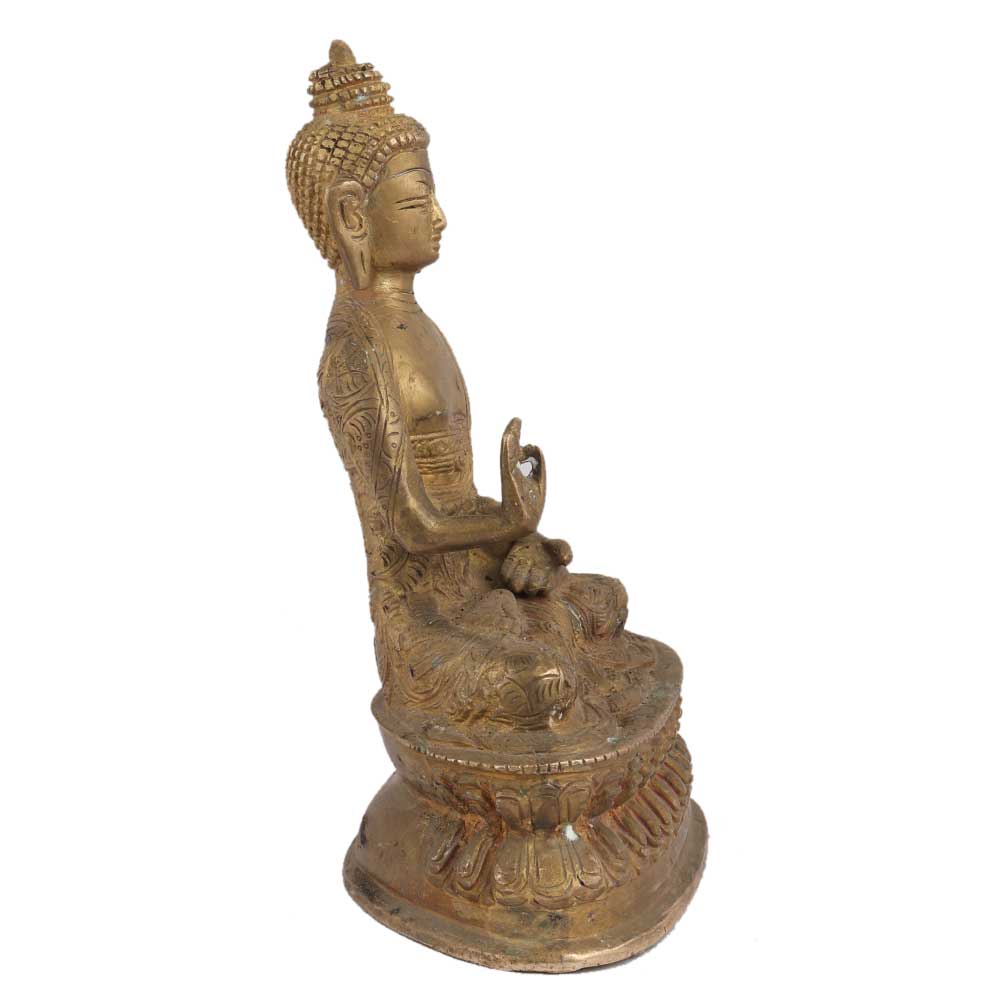 Handmade Astmangal Buddhism Brass Buddha Idol in a meditating pose seated on a lotus platform has a very peaceful face with fine carvings on the robe . Place it on the desk of your office, study table or display unit of your living rom.