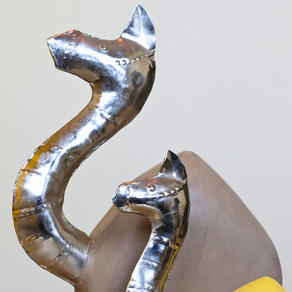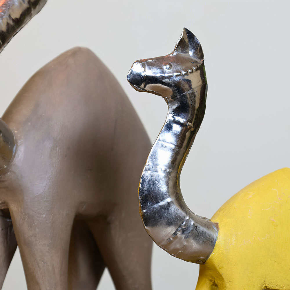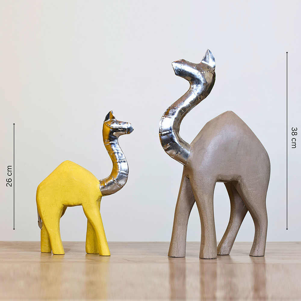 - Wooden camel forms with polished metal heads in brown and yellow tones
