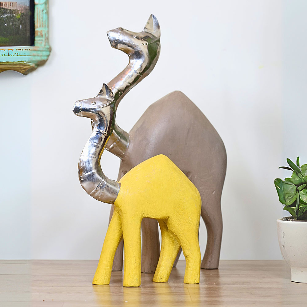 Capture the spirit of the desert with this pair of camel figurines handcrafted from mango wood and accented with polished metal heads. In soil brown and golden yellow finishes, these sculptures infuse rustic charm and wanderlust into any room, making them ideal for collectors, travellers, and thoughtful gifters. Packed & quality-checked by Indianshelf.