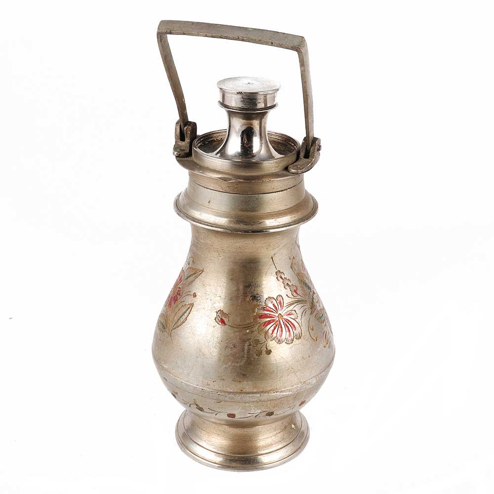 • Carved Flower Brass Gangajal Pot In Silver Finish