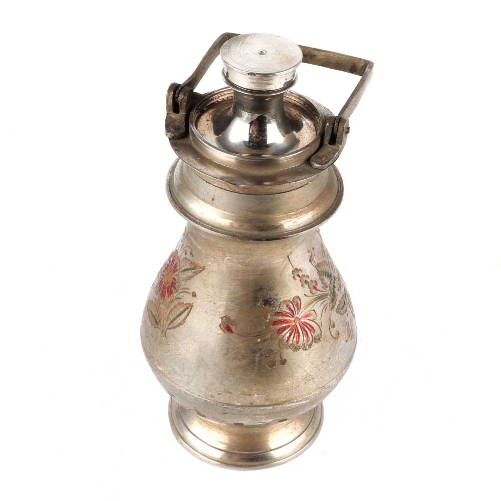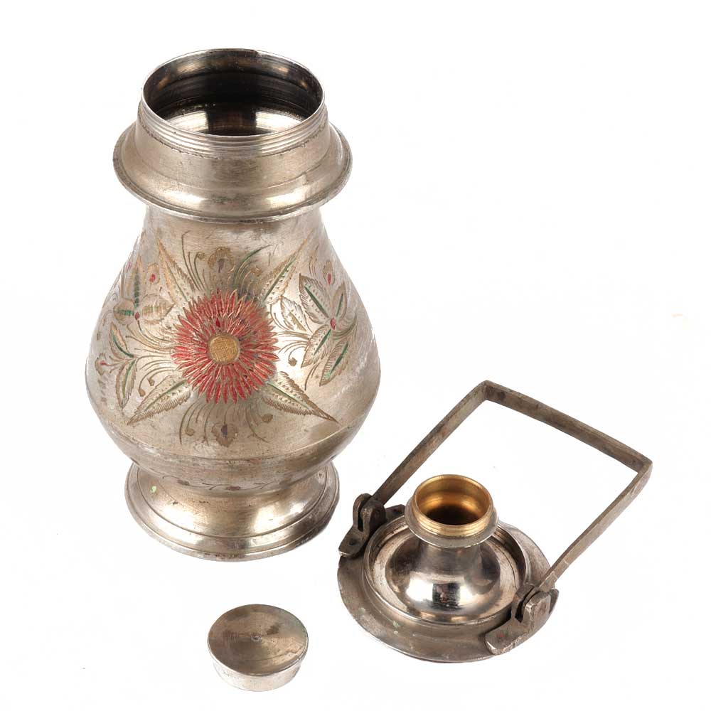 Carved Flower Brass Gangajal Pot In Silver Finish