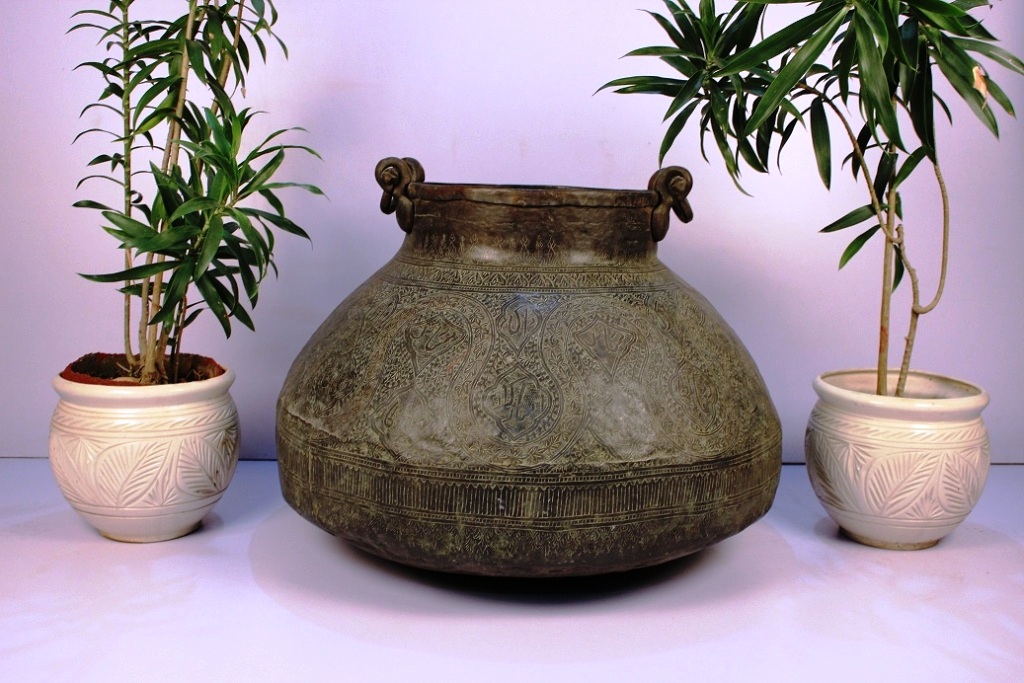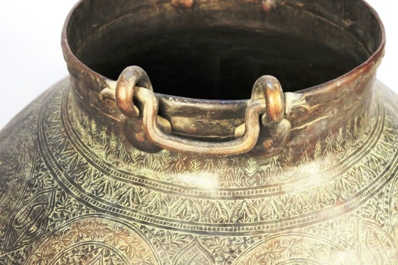 • Carved Flower Vintage Copper Planter With Ring Handles