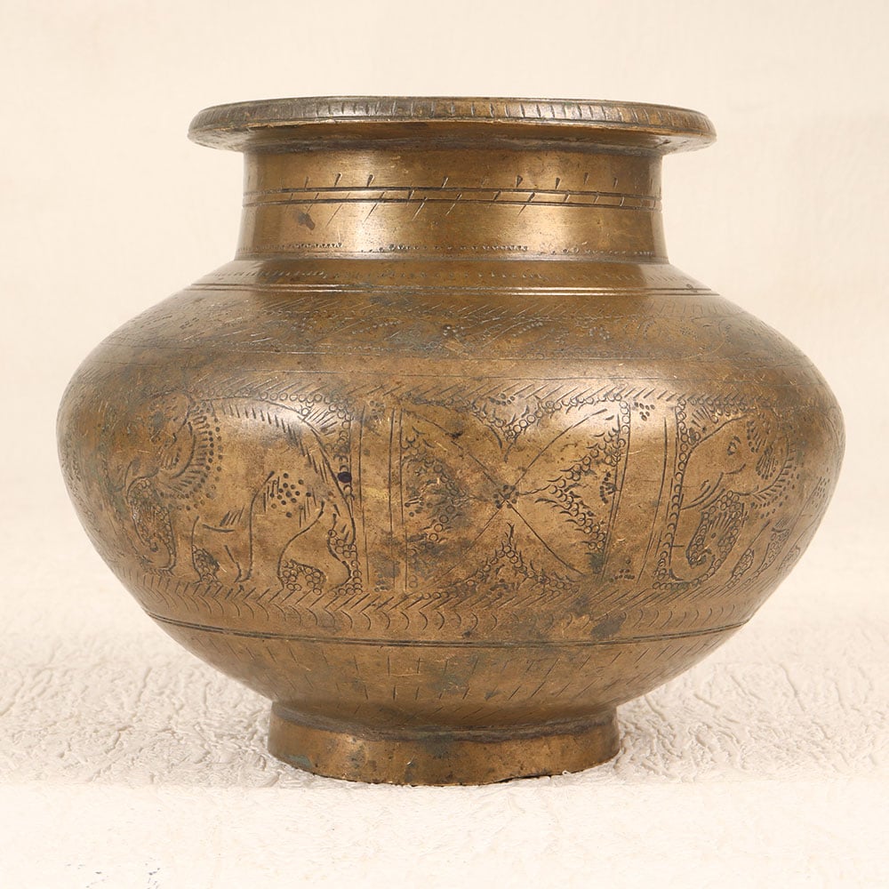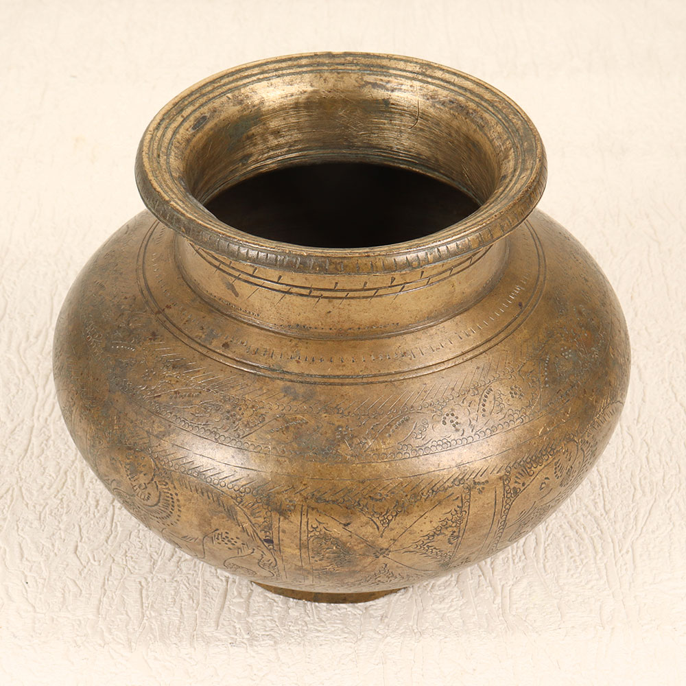 - Intricate brass pot with vintage design from Gujarat, India