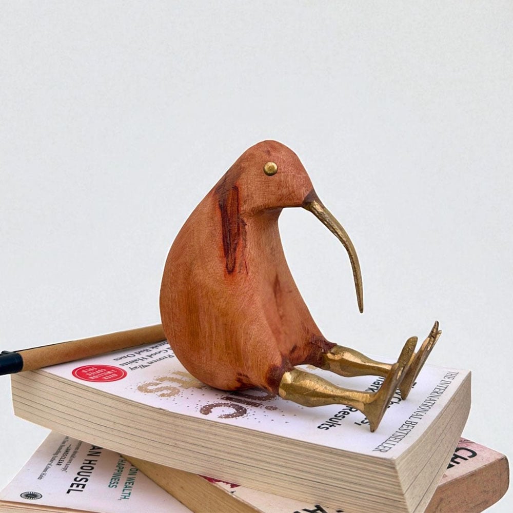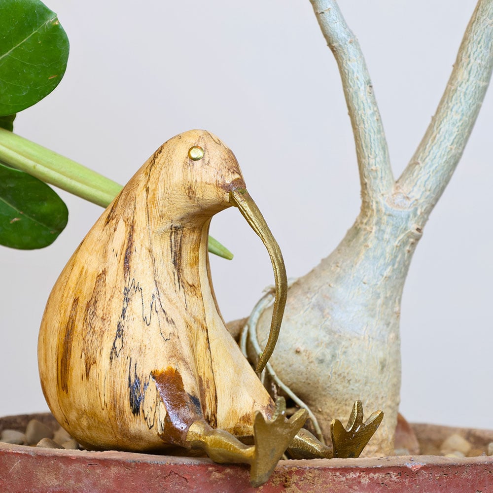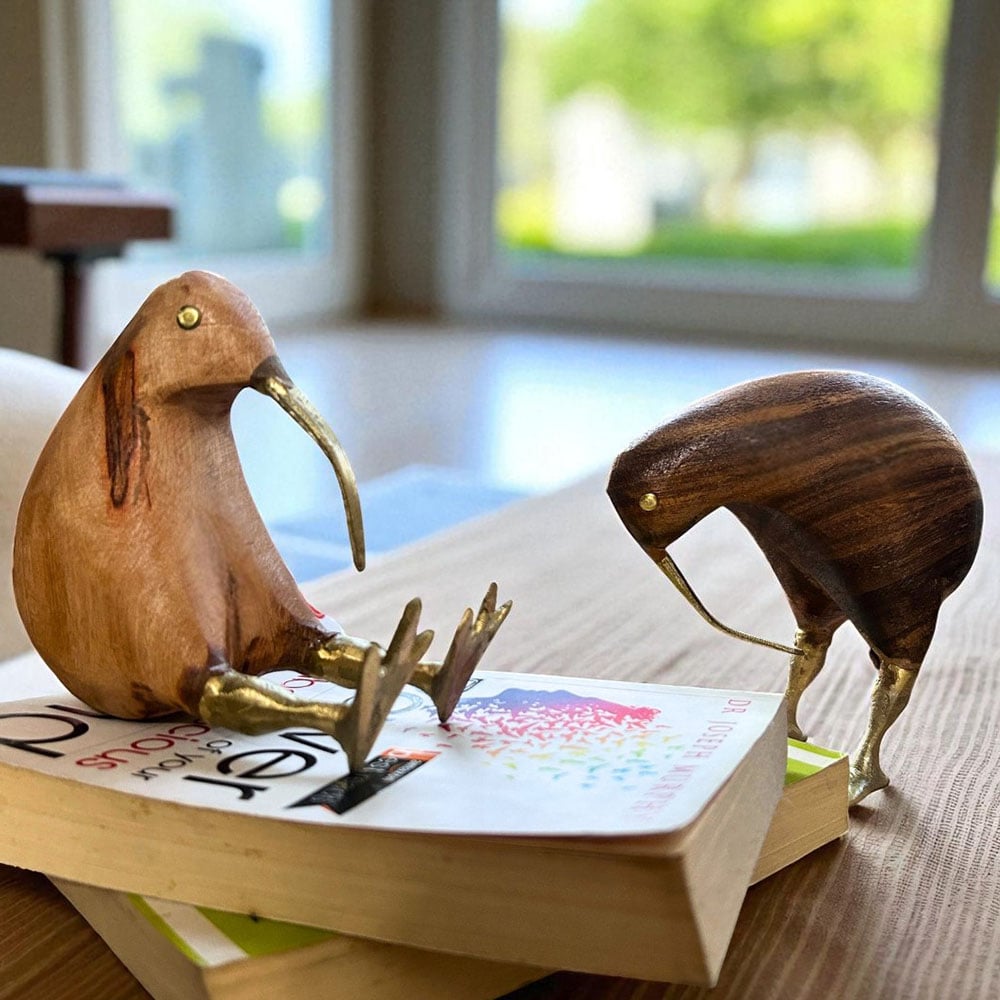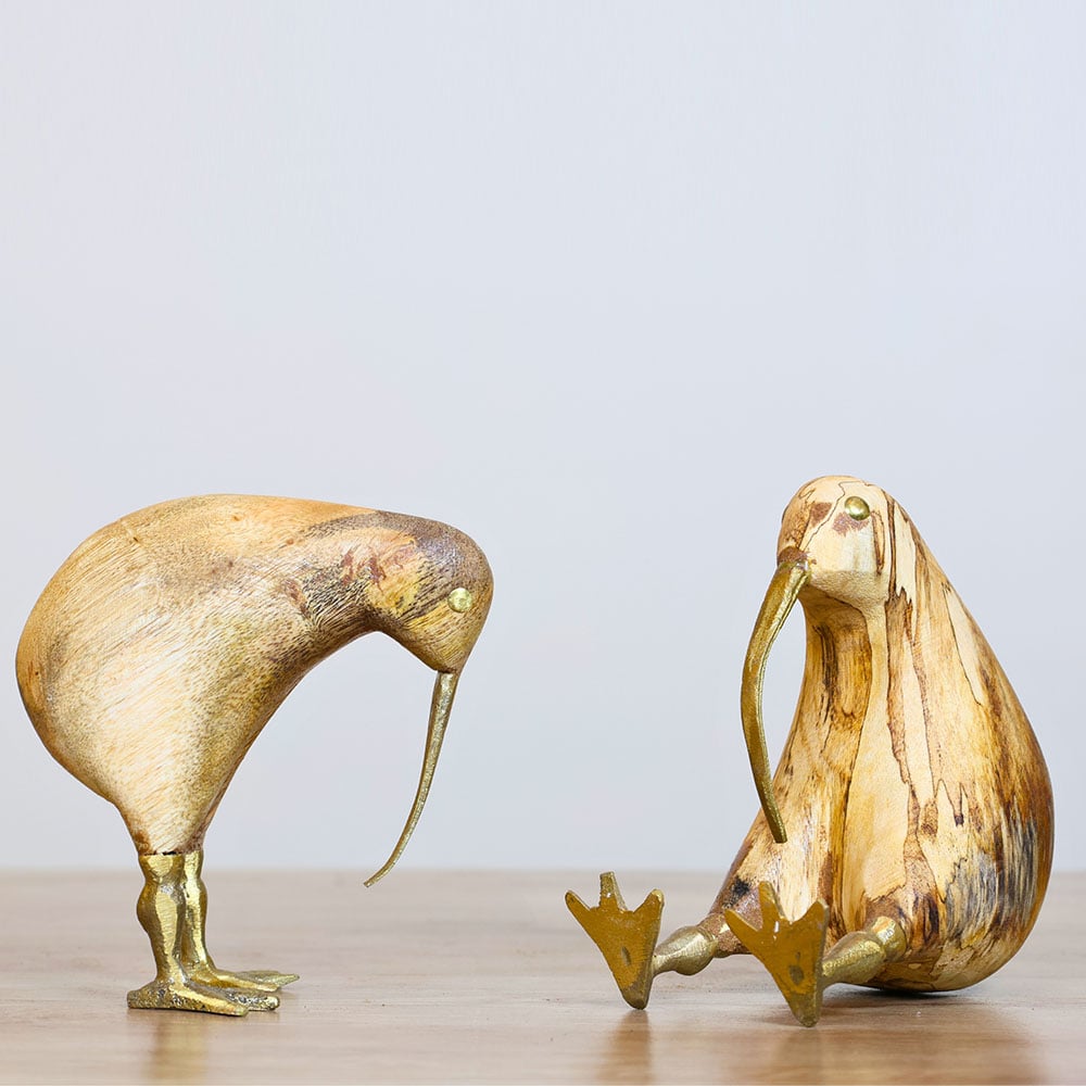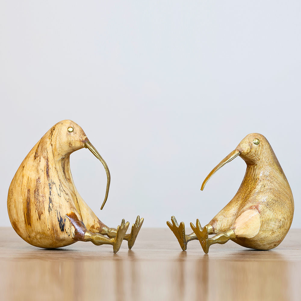 These kiwi bird sculptures celebrate natures quirky beauty. Their carved wood bodies and brass beaks evoke rustic warmth and playful personality, drawing attention from bird enthusiasts and lovers of unique decor. They add a touch of charm to any surface with their sweet silhouettes.