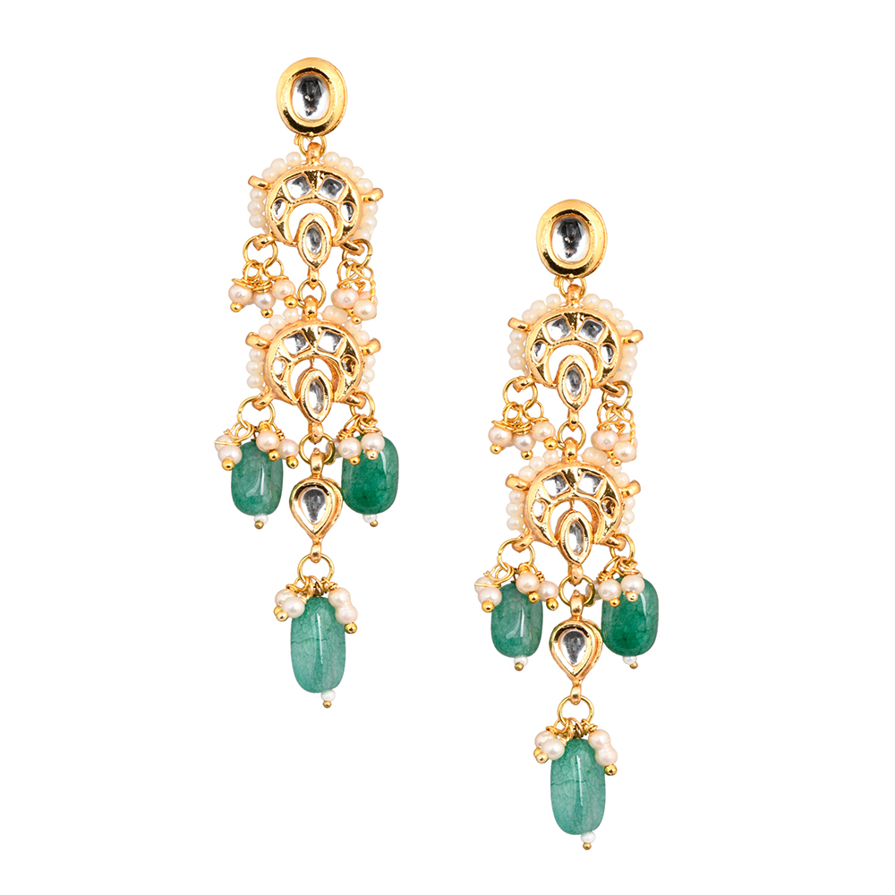 The Cascading Mirror & Green Stone Earrings with Pearl Clusters Pair blends festive brilliance with graceful movement. Crafted in brass with a luminous gold tone finish, these 2.60-inch earrings feature layered mirror elements that reflect light beautifully. A rich green stone anchors the design, adding depth and regal contrast, while delicate pearl clusters soften the silhouette with timeless elegance. Designed for celebration, they create a striking yet refined statement.