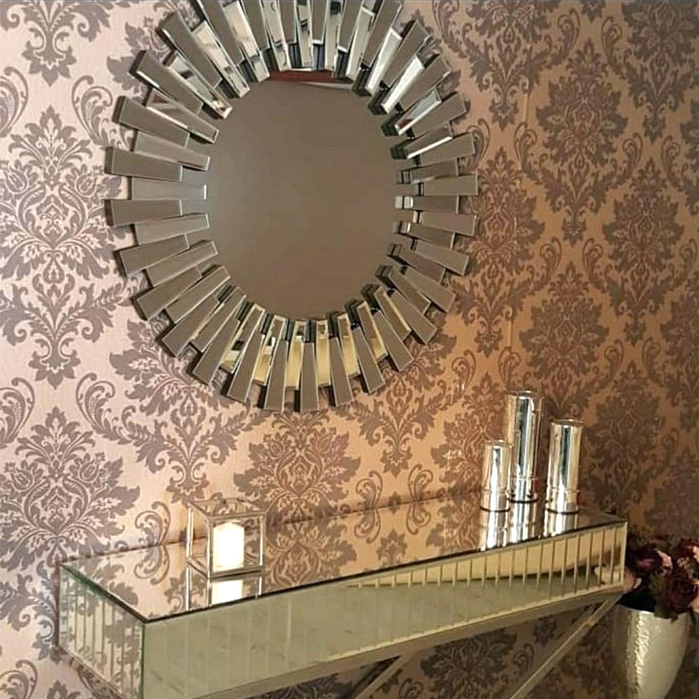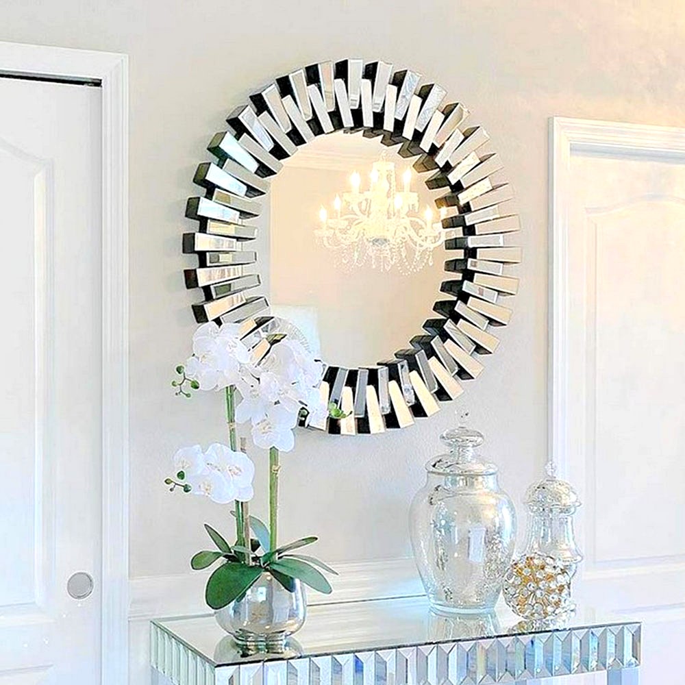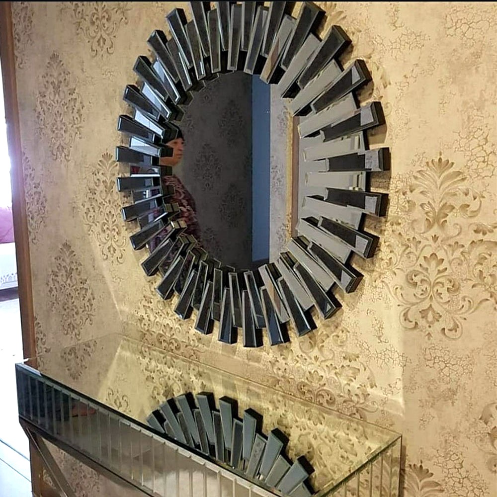 Enhance your interiors with this clear glass beveled sunburst round mirror, designed with angled reflective panels that radiate outward for a striking modern effect. Its polished symmetry and brilliant shine make it a centerpiece of elegance. Packed & quality-checked by Indianshelf.