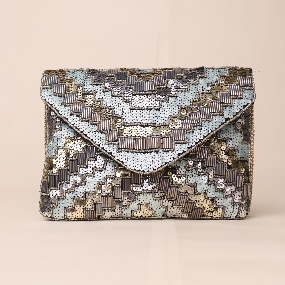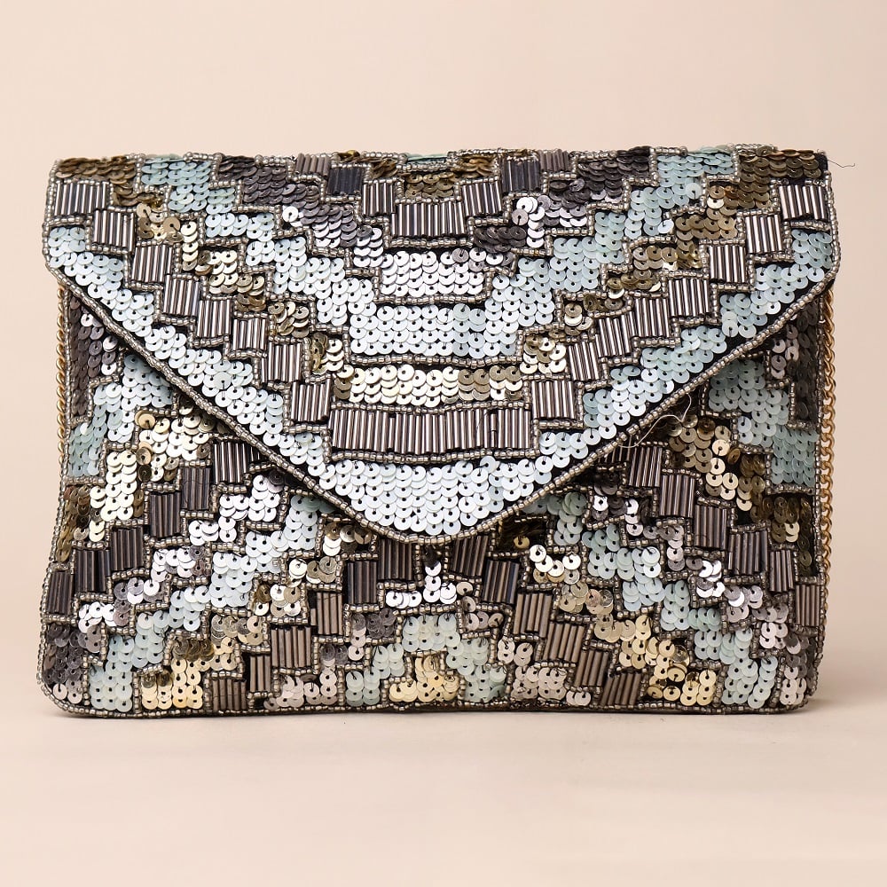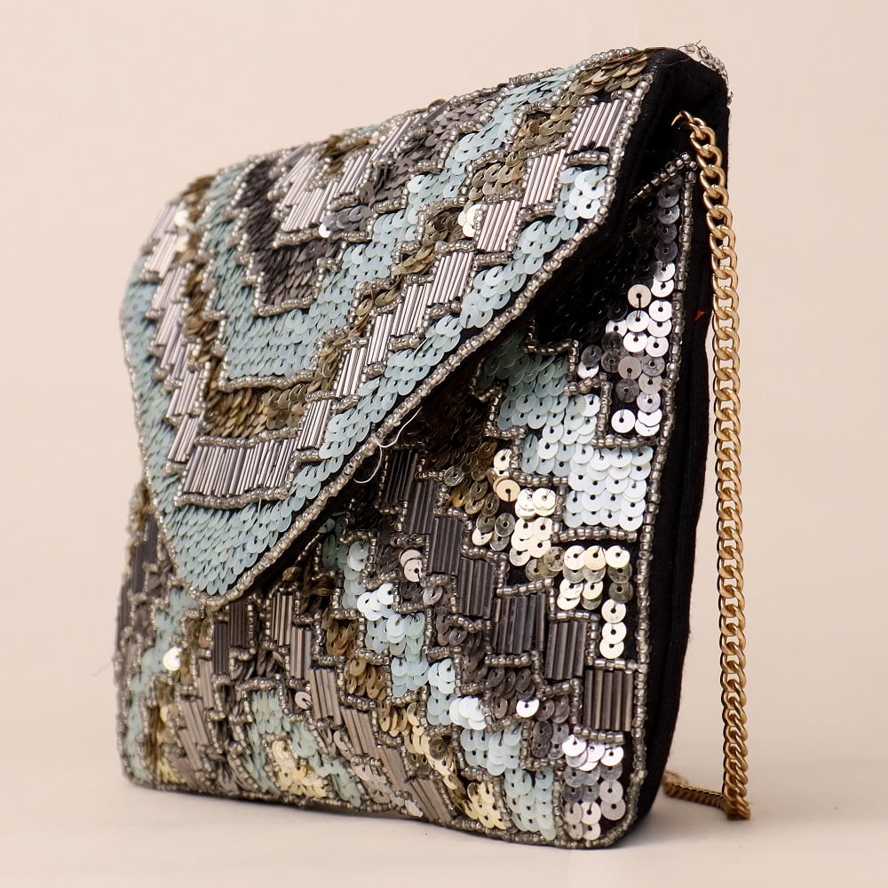 Add a touch of glamour to your evening ensemble with this stunning hand-embellished sling bag, featuring a mesmerizing chevron pattern crafted with shimmering sequins and beads in silver, grey, and icy blue tones. The envelope-style flap exudes elegance, while the gold-tone chain strap offers versatile styling—wear it as a crossbody for effortless chic or detach the chain to carry it as a sophisticated clutch. Perfect for weddings, cocktail nights, and festive celebrations.