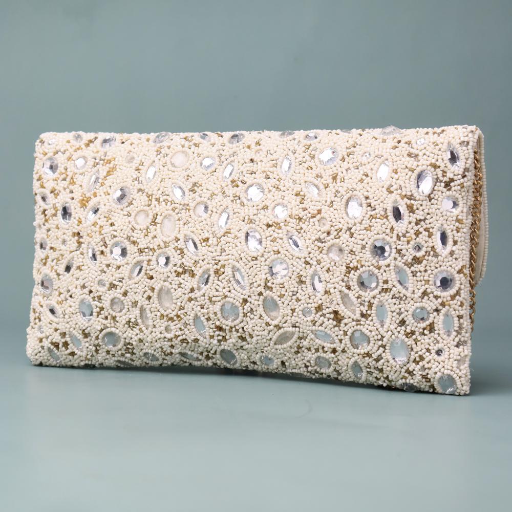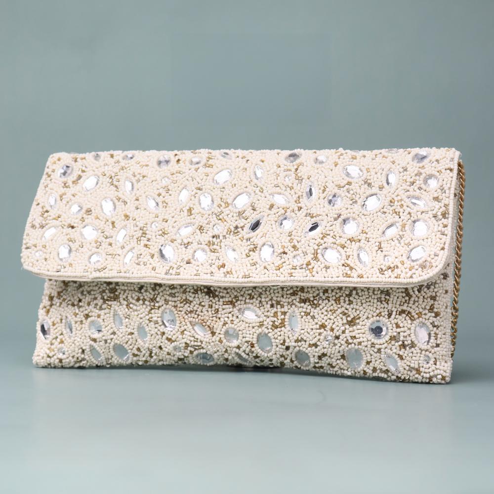 Elevate your evening look with the enchanting Celestial Spark Hand-Embroidered Clutch. Featuring delicate hand beadwork embellished with shimmering mirror accents, this ivory-toned clutch captures the essence of festive luxury. Designed for modern celebrations, it includes a gold-toned chain strap that allows for effortless hands-free elegance. Ideal for weddings, receptions, or festive soirées, this clutch blends traditional artistry with contemporary style.