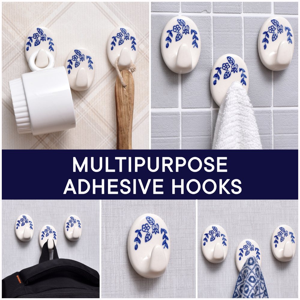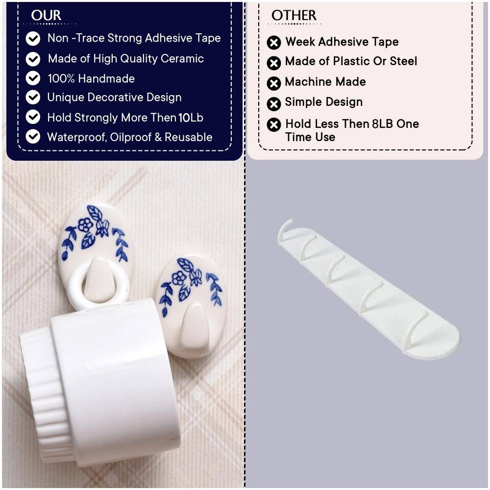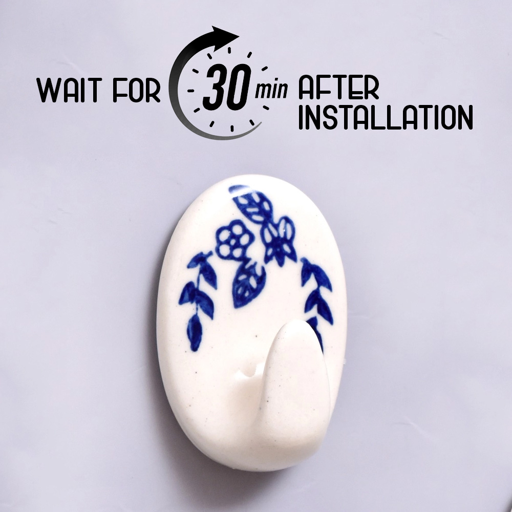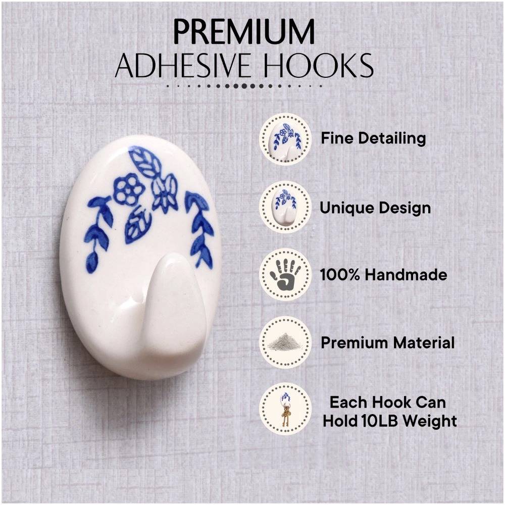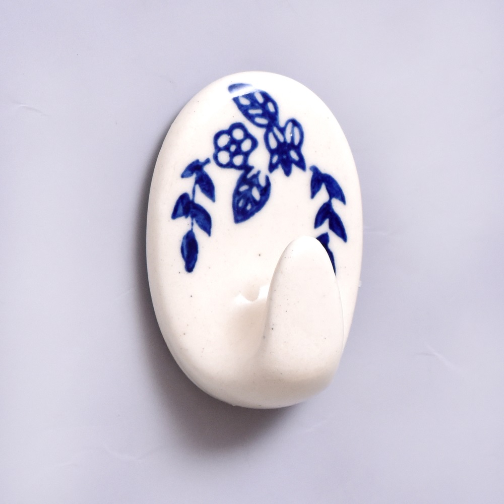 Indianshelf.com for bulk/wholesale orders.Indianshelf.us for personal purchases.Transform your space effortlessly with the Ceramic Blue & White No-Drill Wall Hooks. These wall hooks feature a stunning blue and white ceramic design that adds both charm and functionality to your home. Thanks to the no-drill feature, installation is quick and easy, requiring no tools or causing any wall damage—ideal for renters or anyone seeking a hassle-free solution.