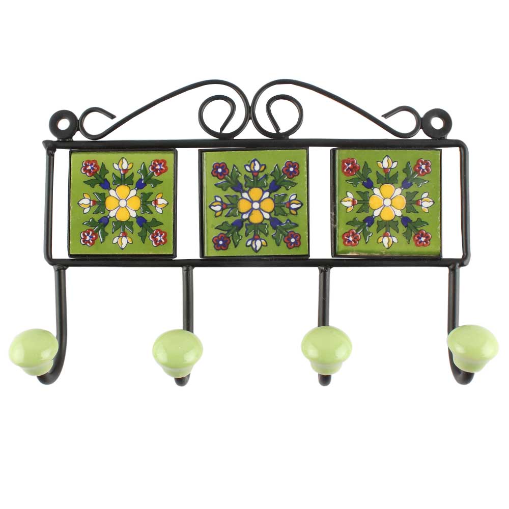 Ceramic Floral Tile Hook in Pea Green. When Put on Wall or Cabinet It is An Art in Itself. The Metal Part of this Hook is Black Powder Coated.