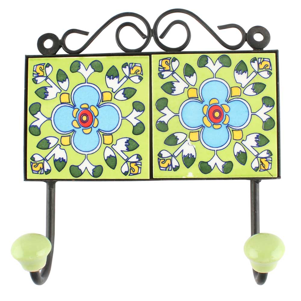 Ceramic Floral Tile hook in Pea Green. When Put on Wall or Cabinet It is An Art in Itself. The Metal Part of this Hook is Black Powder Coated.
