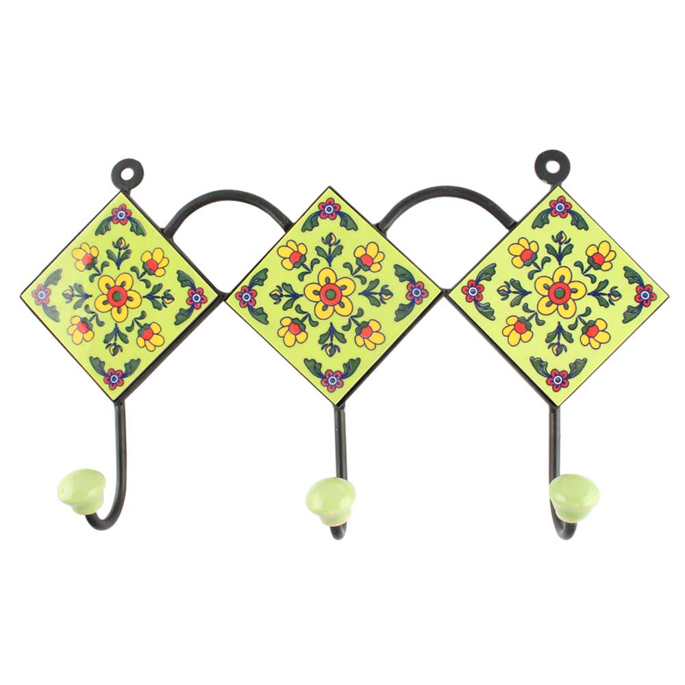 Ceramic Floral Tile Hook in Pea Green. When Put on Wall or Cabinet It is An Art in Itself. The Metal Part of this Hook is Black Powder Coated.