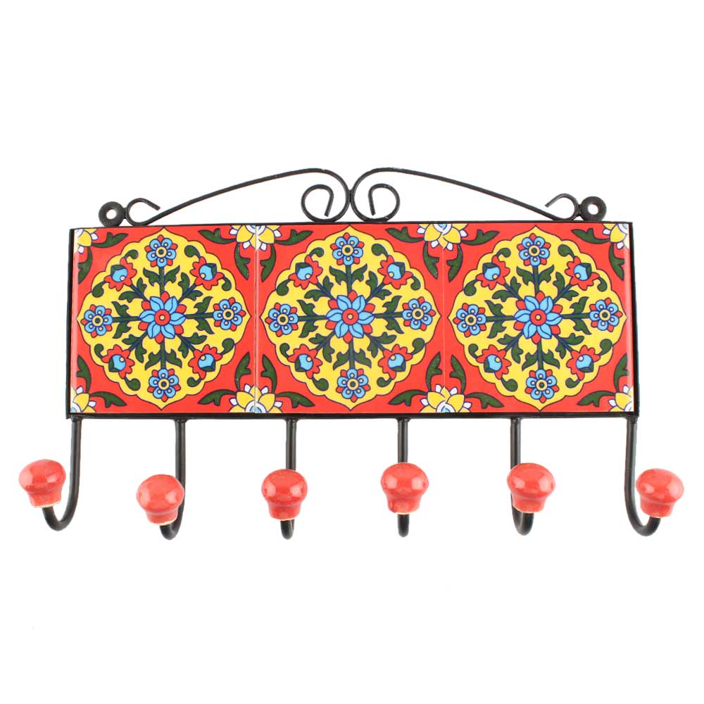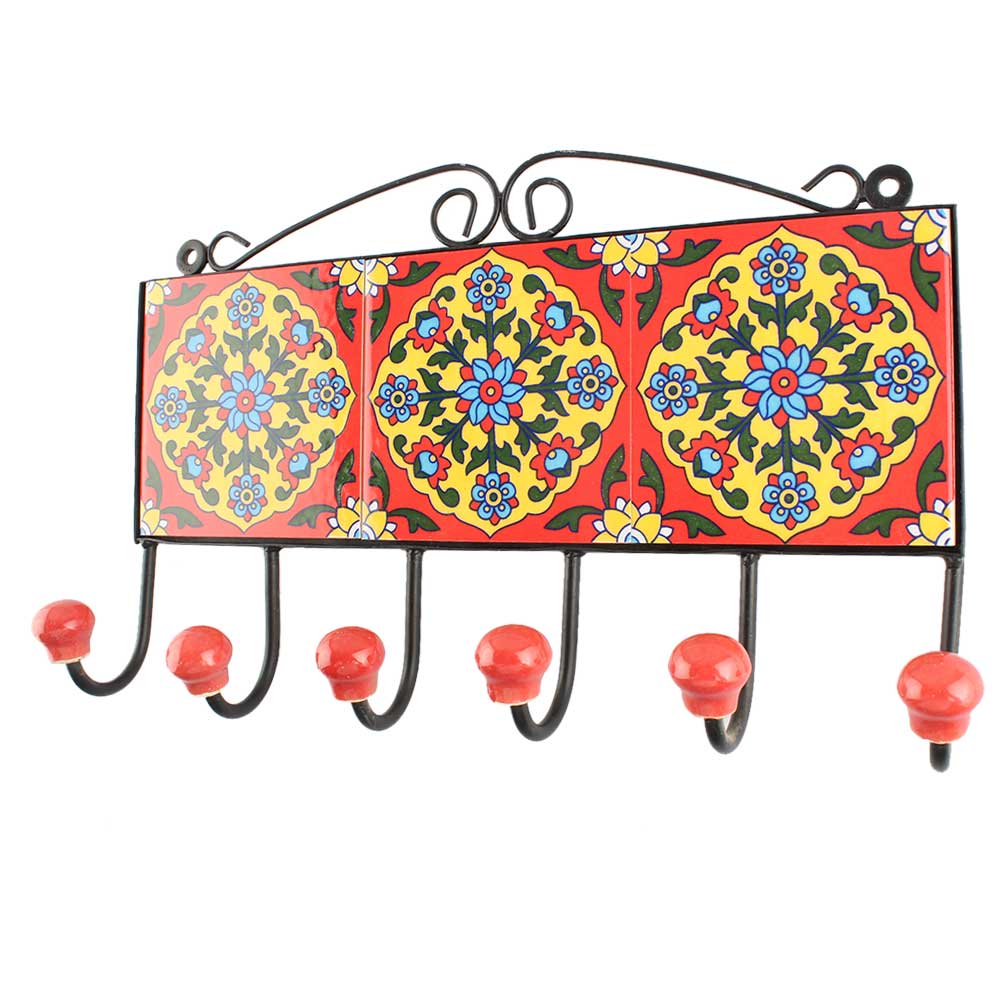 Ceramic Floral Tile Hook in Red. When Put on Wall or Cabinet It is An Art in Itself. The Metal Part of this Hook is Black Powder Coated.