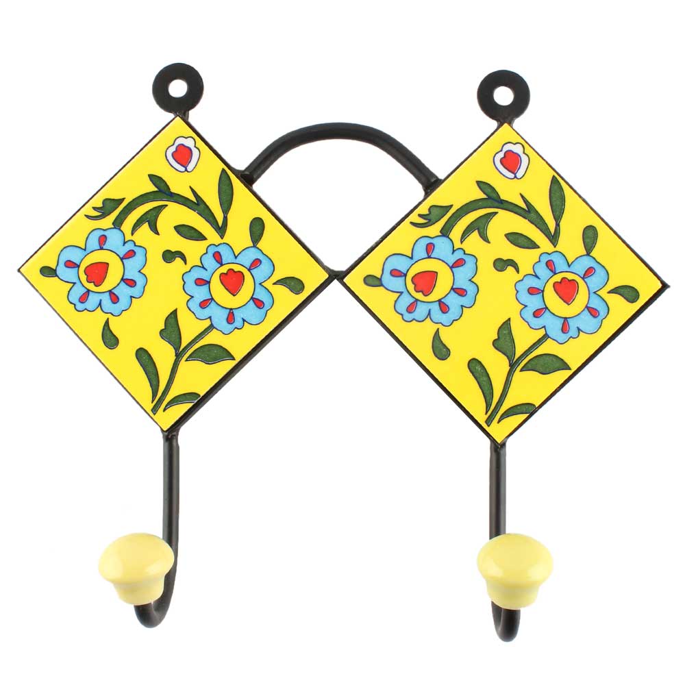 Ceramic Floral Tile Hook in Yellow. When Put on Wall or Cabinet It is An Art in Itself. The Metal Part of this Hook is Black Powder Coated.