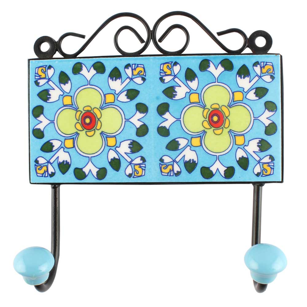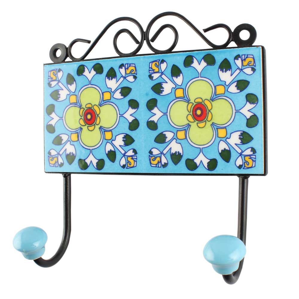 Ceramic Floral Wall Hook in Turquoise. When Put on Wall or Cabinet It is An Art in Itself. The Metal Part of this Hook is Black Powder Coated.