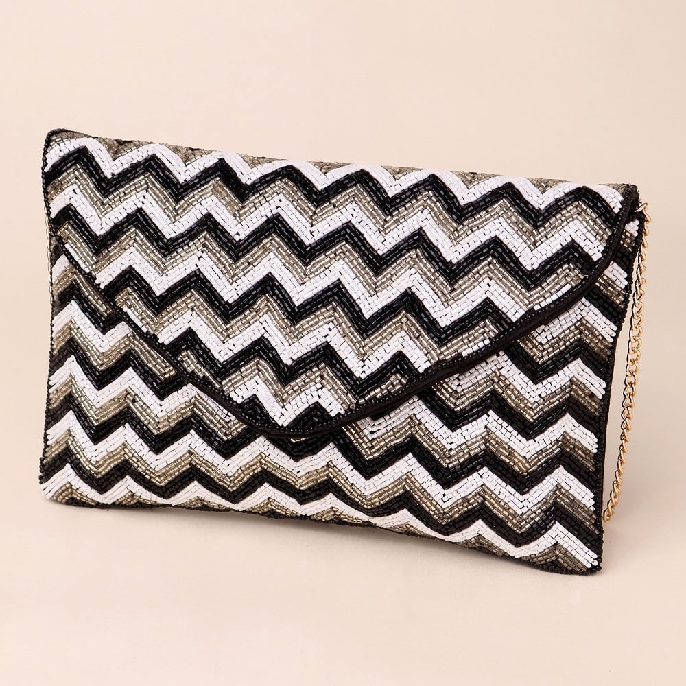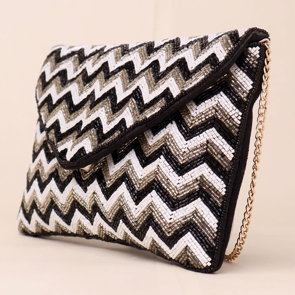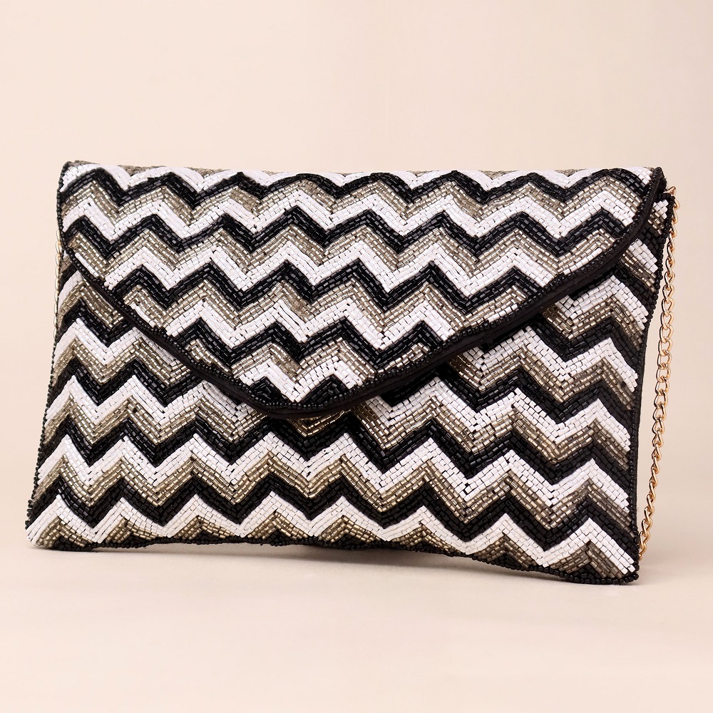 - Design Pattern: Hand-beaded clutch with chevron zigzag pattern