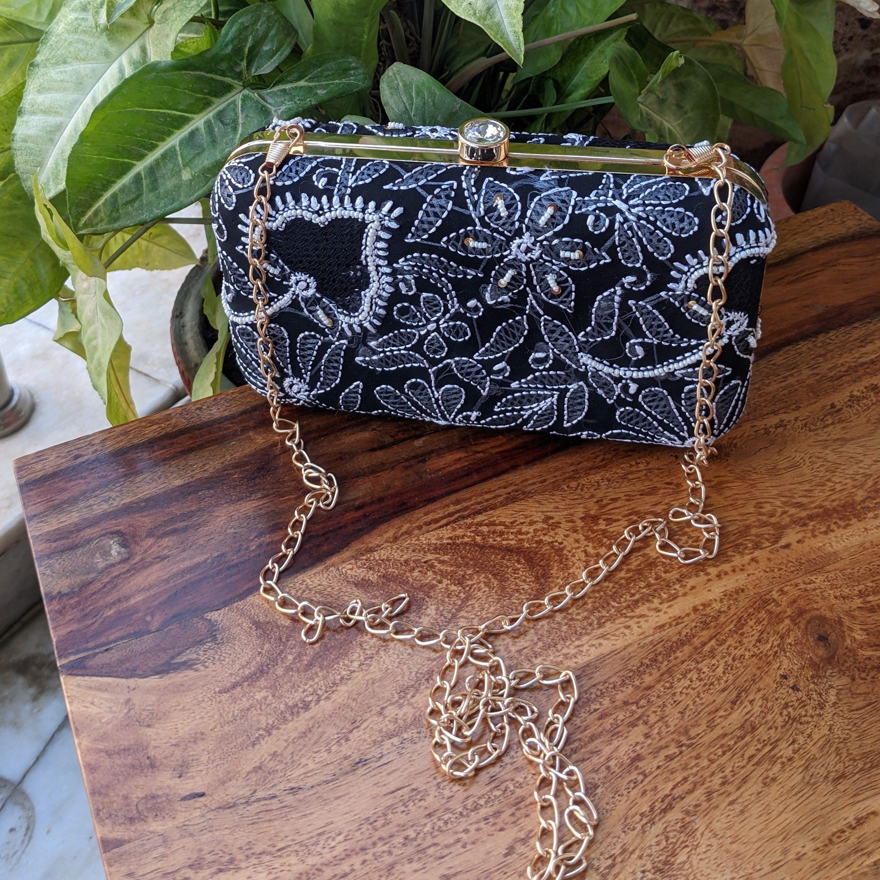 Make a refined style statement with this stunning handcrafted clutch, designed in rich black georgette and adorned with elegant Chikankari embroidery. The intricate white threadwork is beautifully complemented by delicate pearl highlights, creating a timeless, eye-catching contrast. Perfectly blending traditional craftsmanship with modern elegance, the floral and paisley motifs lend this clutch an air of sophistication. The clutch features a sleek metal frame closure topped with a crystal knob and includes a gold-toned metal chain strap for versatile styling—carry it as a sling or a chic handheld accessory. Lightweight and compact, it's ideal for storing your phone, cards, keys, and a few makeup essentials. Whether you're styling it with a saree, anarkali, or a contemporary Indo-western look, this clutch adds a graceful touch to any outfit. Ideal for weddings, festive events, or evening gatherings, it’s the perfect accessory for anyone who appreciates fine detailing and effortless charm.