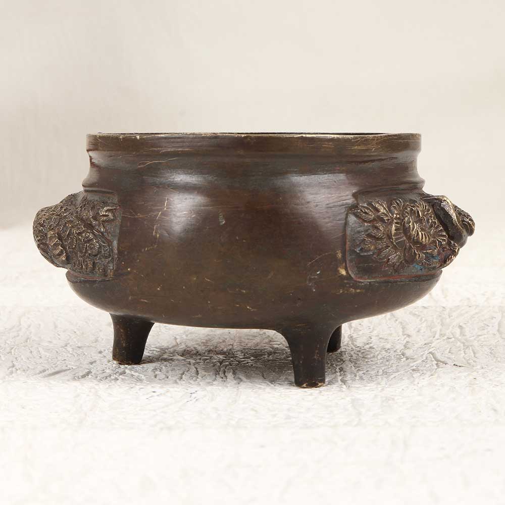 - Vintage brass construction with brown finish and carved details inspired by antique Chinese pots