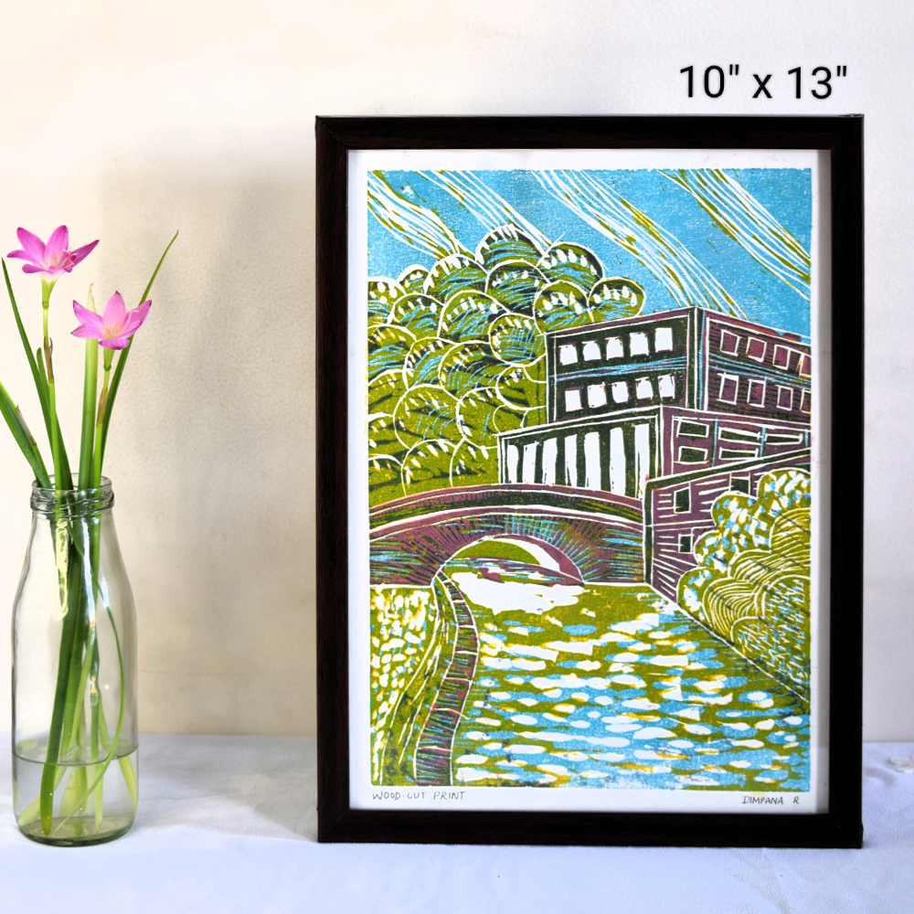 A vibrant and stylized woodcut print depicting a cityscape with a prominent arched bridge over a flowing river, set against a backdrop of modern buildings and lush green trees. The dynamic lines and bold textures add a sense of movement to the sky and water, while the use of contrasting hues like blue, olive green, and maroon gives the artwork a unique and contemporary charm. This handcrafted print blends architectural structure with natural beauty, perfect for collectors of printmaking and modern art.