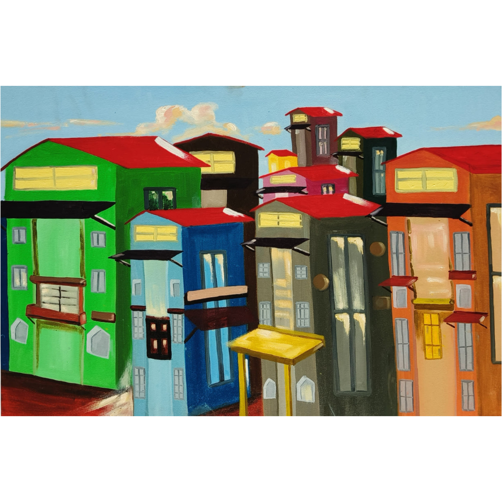 In Cityscape – Vertical Echoes, artist B. Manikanta brings to life a whimsical interpretation of the urban skyline on a 3 x 2 feet oil on canvas. With vivid hues of green, blue, ochre, and red, this composition transforms high-rise buildings into a rhythmic, almost musical arrangement. Each structure stands tall with glowing windows and angled roofs, creating a surreal city that feels both familiar and dreamlike. The painting reflects themes of density, harmony, and individuality within the collective chaos of urban life. Through bold colors and stylized geometry, Manikanta captures the vibrant soul of modern cities—a statement piece for lovers of contemporary and ex pressive cityscape art.