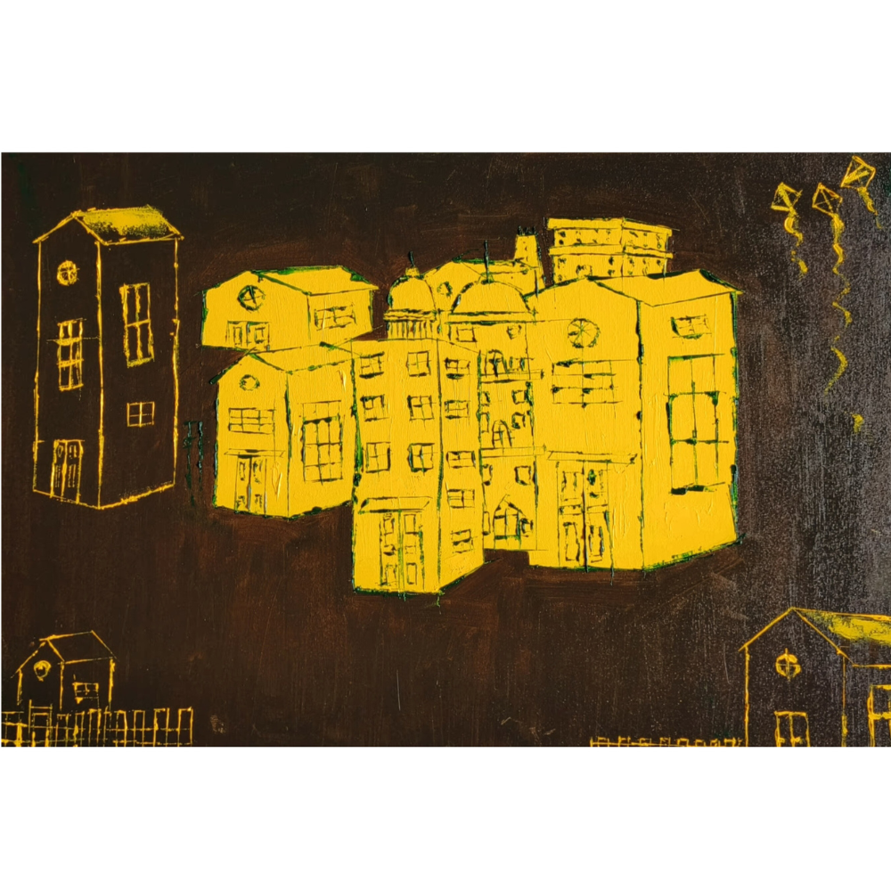 In Cityscape – Yellow Silence, artist B. Manikanta explores urban life through a minimalist and symbolic lens. Painted in oil on a 3 x 2 feet canvas, this work features yellow architectural outlines set against a rich, earthy brown background. The buildings, drawn with sketch-like precision, appear dreamlike and suspended—suggesting a city remembered rather than observed. Subtle elements like floating kites and fences add a nostalgic touch, evoking memories of childhood and community. Through restrained color and line, Manikanta strips the city down to its emotional core, inviting viewers to reflect on space, memory, and belonging. A powerful piece for admirers of ab stract, conceptual urban art.