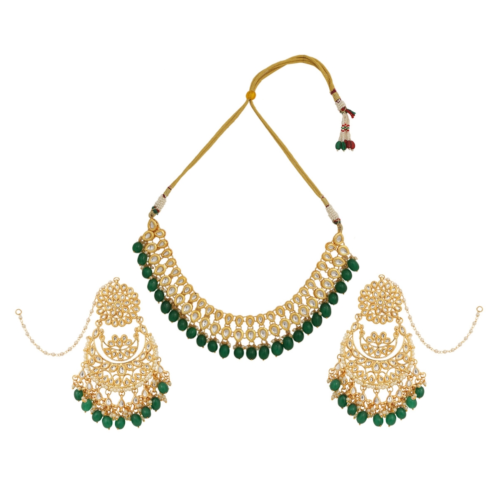 The Classic Kundan Necklace Set with Chandelier Earrings brings timeless Indian jewelry craftsmanship to ceremonial and festive occasions. Crafted in polished golden brass, the necklace features traditional Kundan style stone settings that create a rich and radiant design. The extended 30 inch length drapes elegantly along the neckline, offering a graceful statement for bridal and festive styling. Paired with ornate chandelier earrings, this handcrafted set captures the essence of heritage inspired elegance.