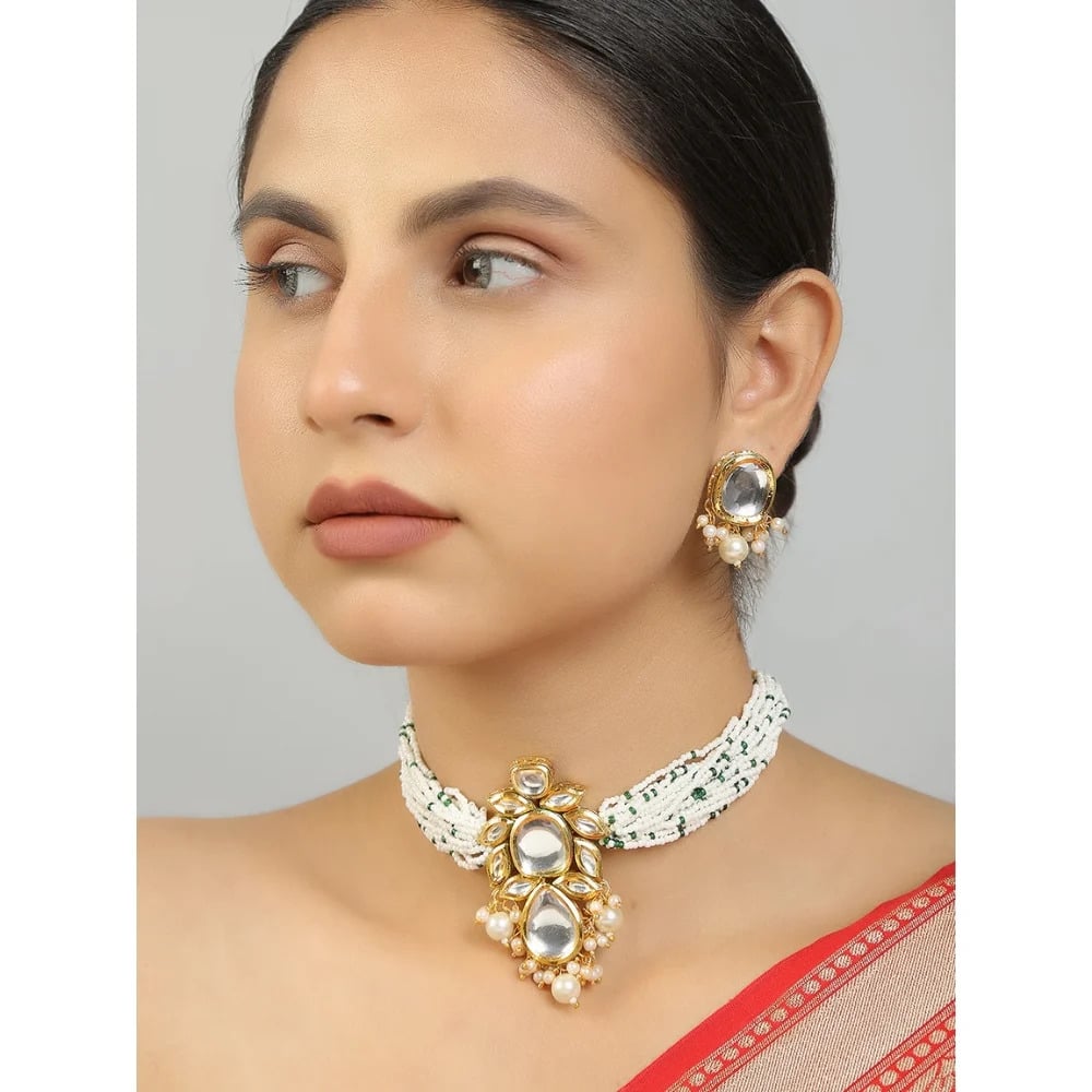 The Classic Kundan Pearl Choker Necklace Set captures the richness of traditional Indian jewelry with refined craftsmanship. Crafted in polished golden brass, the choker features intricate Kundan style stone settings highlighted by delicate pearl accents. The elegant design frames the neckline beautifully while maintaining a graceful balance between grandeur and sophistication. With its 26 inch length, this handcrafted set creates a regal statement for weddings and festive celebrations.