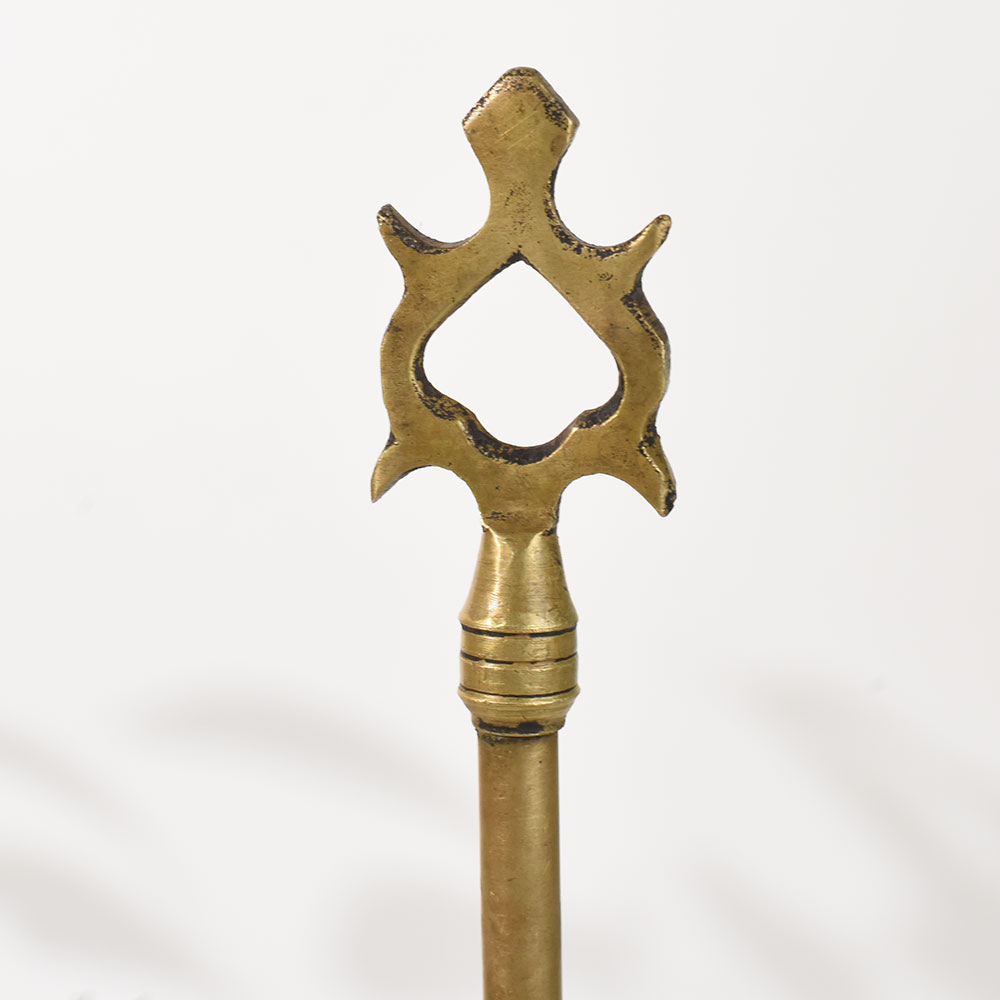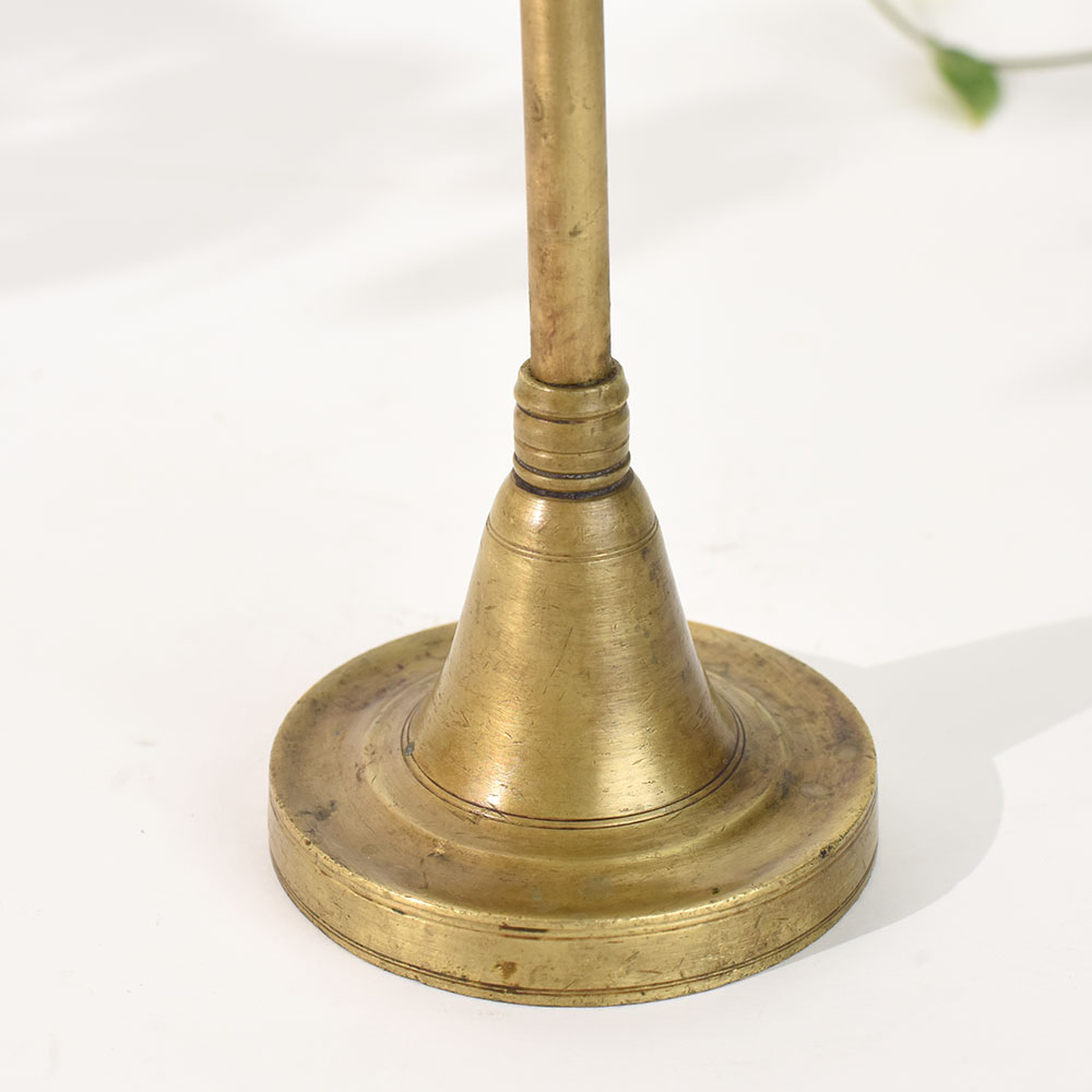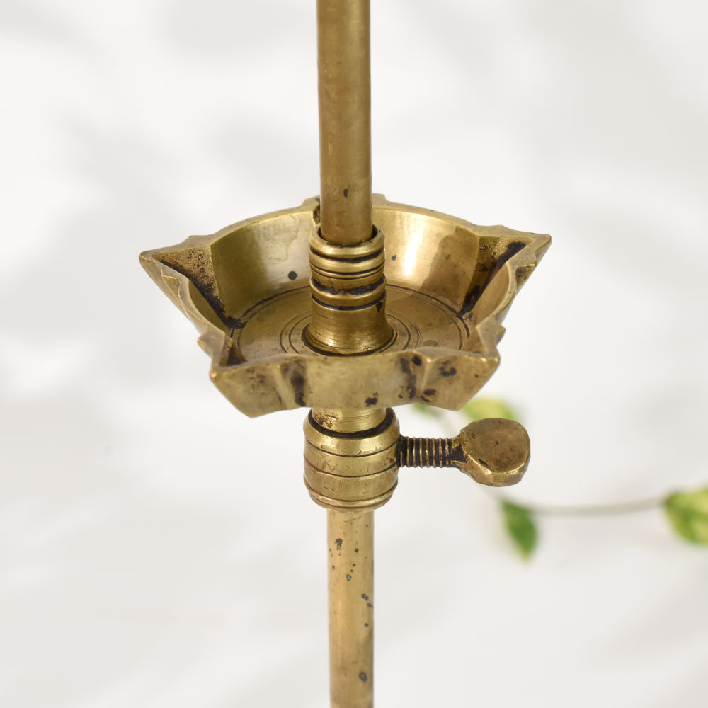 Celebrate the charm of South Indian craftsmanship with this vintage brass oil lamp stand with adjustable height, designed to bring a serene and traditional glow to your decor. Handcrafted by skilled artisans, the lamp features a tall slender column, a classic diya plate, and an ornate finial that reflects authentic temple-style design. The warm brass patina enhances its heritage appeal, making it a timeless piece for pooja rooms, festive decor, or cultural home styling. Its adjustable height mechanism allows you to raise or lower the diya plate, offering convenience for rituals, meditation, or decorative placements. Whether used with oil or simply displayed as a statement accent, this lamp stand beautifully merges utility with artistic elegance.
