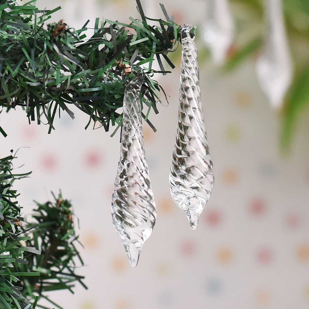 The Clear Crystal Glass Twisted Icicles create a magical and elegant ambiance in your home. Their shimmering appearance, especially when illuminated by Christmas lights, adds a dazzling sparkle to your festive setup, bringing a sense of winter wonderland into your space.