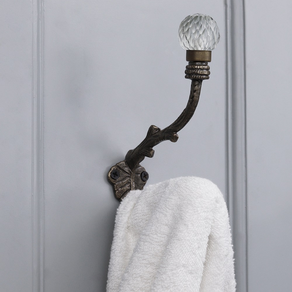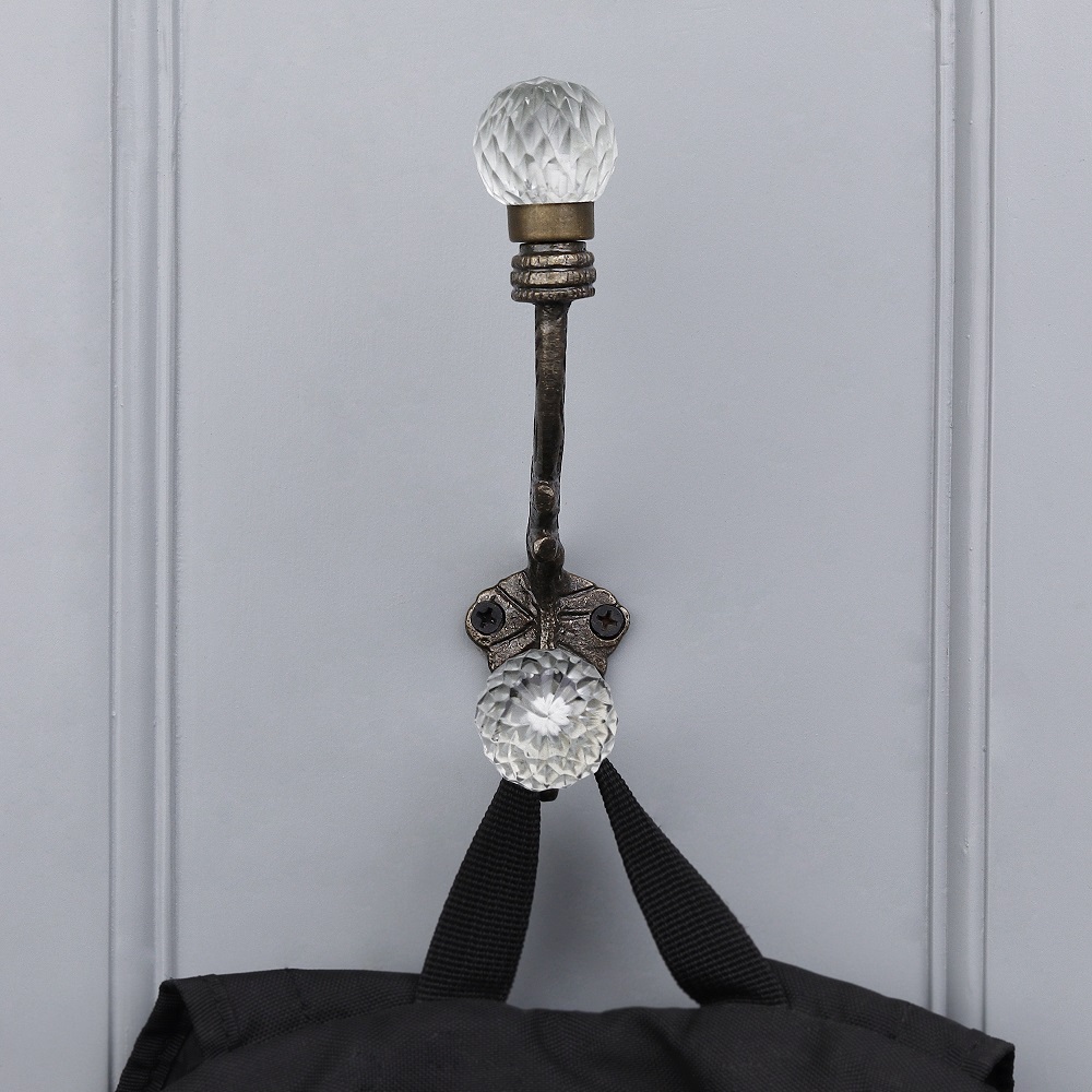 Material: Clear glass knob with heavy-duty iron hook Finish: Glossy transparent glass with matte black iron base Installation: Single-screw mount; includes wall plug and screw