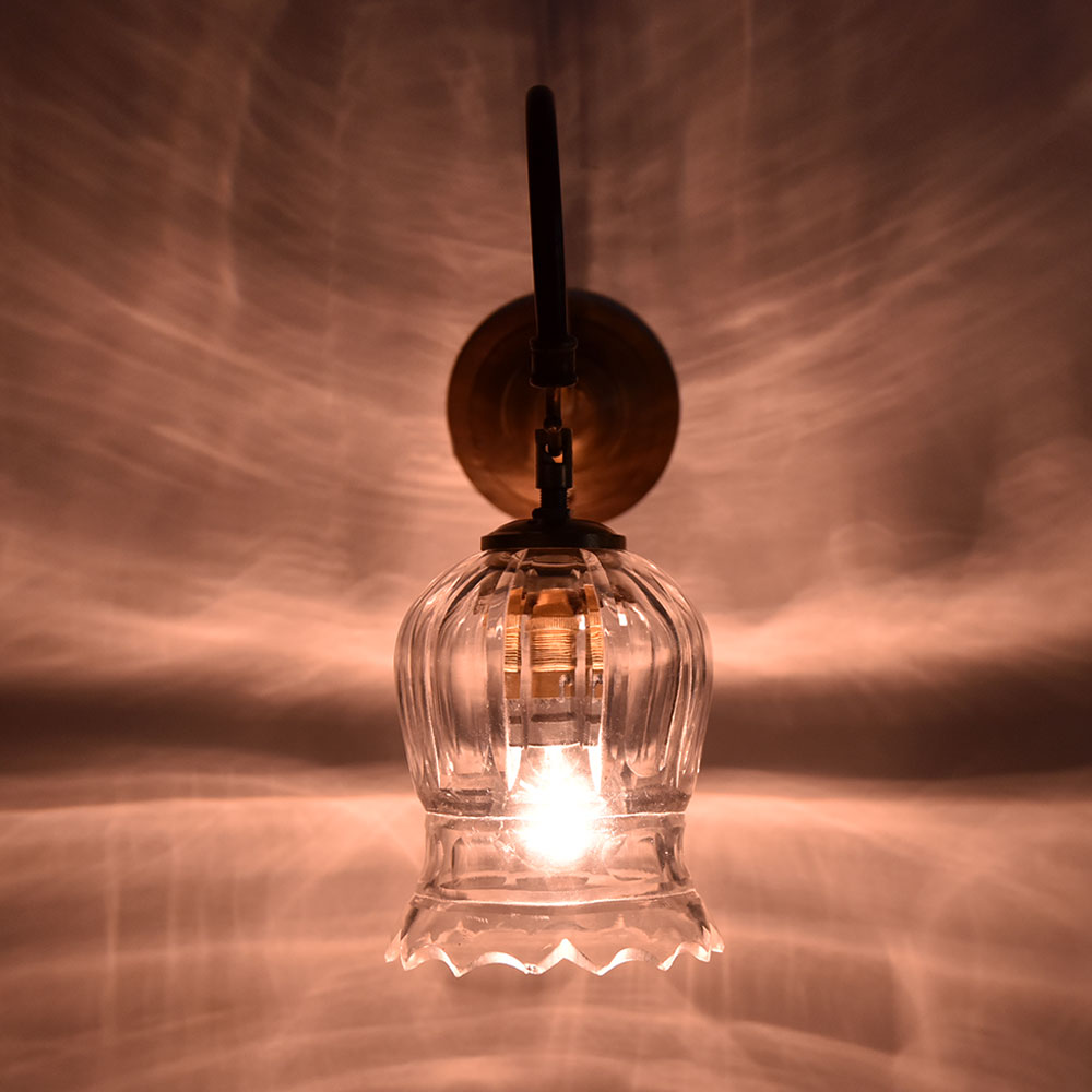 Clear glass tulip shaped wall lamp with bronze bracket. The lamp is unique and allows a great lighting option for any room.