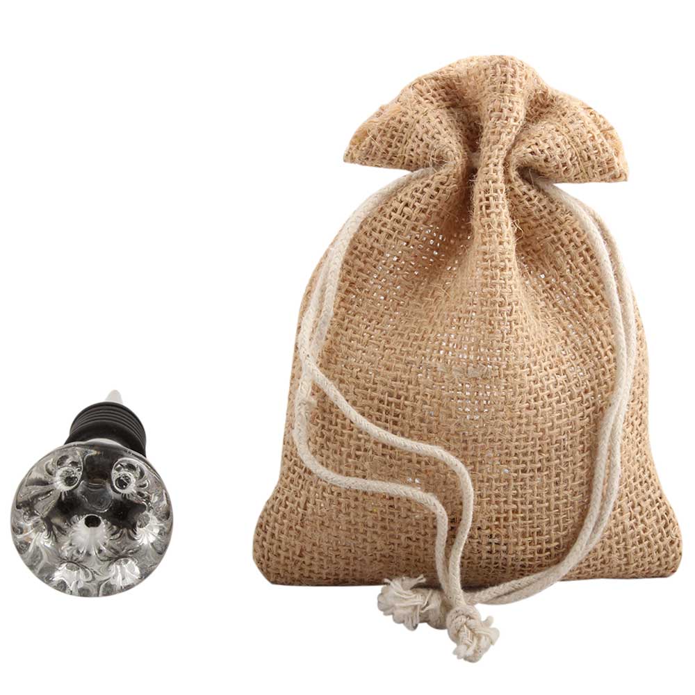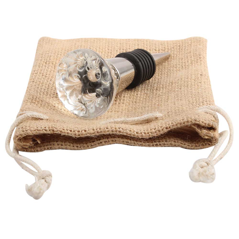 Clear Inside Hole Oval Shape Glass Wine Stopper. Zinc Alloy Wine Bottle Stopper with Attractive Jute Bag Packaging.