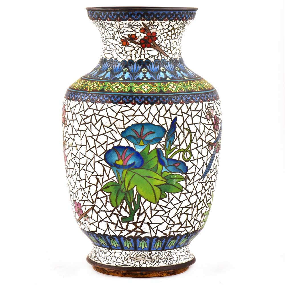 Decorative enameled metal ware called cloisonné exhibit almost superhuman skill by master craftsmen displayed by the marvelous diversity, intricacy and beauty of their designs. Earliest decorative motifs include cloud patterns, lotus flowers, the symbol of purity and beauty later motifs included dragons amid clouds, floral landscapes, scenes from court and mystical animals. Exquisitely detailed petals and leaves with fine color gradations. Fine inlaid wirework at neck and base, which are edged in brass. Exquisitely detailed petals and leaves with fine color gradations. Dark cobalt blue ground with white, rust, orange, yellow, and mauve blossoms; foliage in shades of green edged in rust are some of the popular designs of cloisonné.