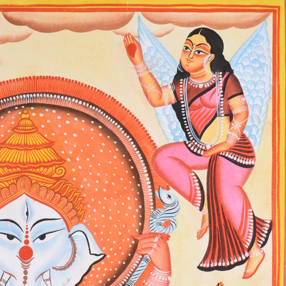 Central dancing figure of Lord Ganesha standing on a lotus pedestal Two mice shown as devoted attendants in symmetrical poses Winged celestial figures above, adding movement and celebration Bold outlines, flat vibrant colors, and decorative borders typical of Kalighat styleProduct Specification