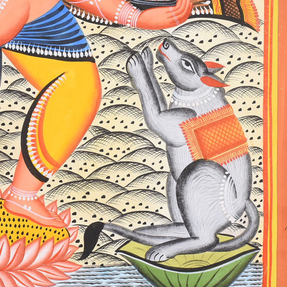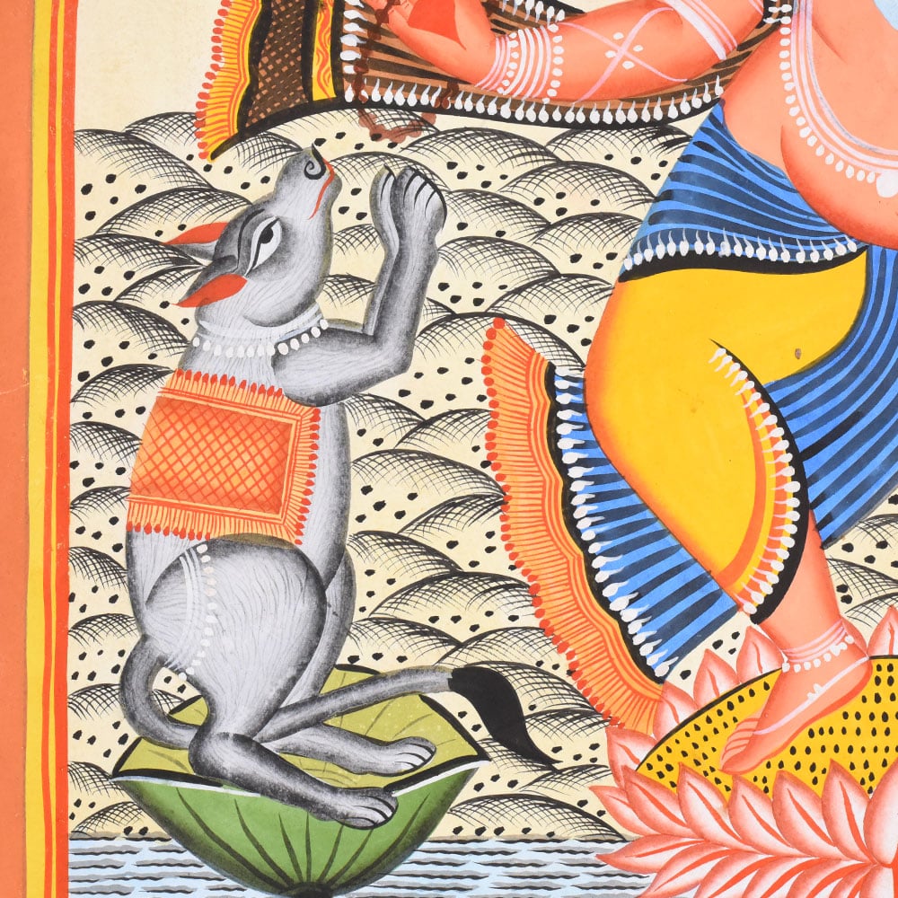 This Kalighat painting on cloth and paper presents a vibrant and auspicious depiction of Lord Ganesha in a dancing posture, rendered with the bold clarity and devotional warmth characteristic of the Kalighat tradition. Ganesha stands at the center upon a blooming lotus that rises from gently rippling water, symbolizing purity and spiritual awakening. His elephant head, elongated trunk, and calm, half-closed eyes convey wisdom and benevolence, while his dynamic stance introduces a sense of rhythm and divine movement. Multiple arms extend outward, each holding ritual objects or forming symbolic gestures associated with protection, prosperity, and the removal of obstacles. Flanking Ganesha on either side are two grey micehis traditional vahanasshown standing upright with folded hands in devotion. Their mirrored poses add symmetry and a touch of narrative charm to the composition. Above, two winged celestial attendants descend from the sky, their raised arms and flowing garments suggesting celebration and divine approval. A glowing circular halo behind Ganeshas crown emphasizes his sacred presence and anchors the composition visually. The background is filled with patterned earth and water motifs, rendered through repetitive lines and dots that create texture while maintaining the flatness typical of Kalighat painting. The color palette is lively and harmonious, dominated by warm oranges, reds, yellows, and soft blues, outlined with strong black contours. Decorative borders frame the scene, enhancing its iconic, shrine-like quality. Executed on cloth and paper, the painting reflects the Kalighat artists ability to combine religious symbolism, folk aesthetics, and visual storytelling into an accessible yet powerful devotional image.