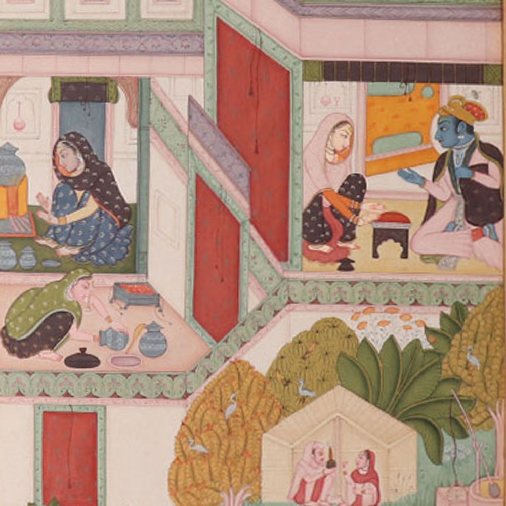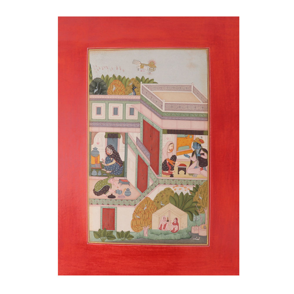 This is the typical bundi school barahmasa Hindi months paus painting of Krishna and Radha (Dec-Jan) Krishna is the main character in the cloth-based picture, which features natural pigment colours and depicts the winter season. This Rajasthani artwork was created by Bundi Marwar. Use Rajasthani colours and traditional decor. The remaining 11 months in the picture are based on the Hindu month 12 (barahamasa paus), which is the winter season.