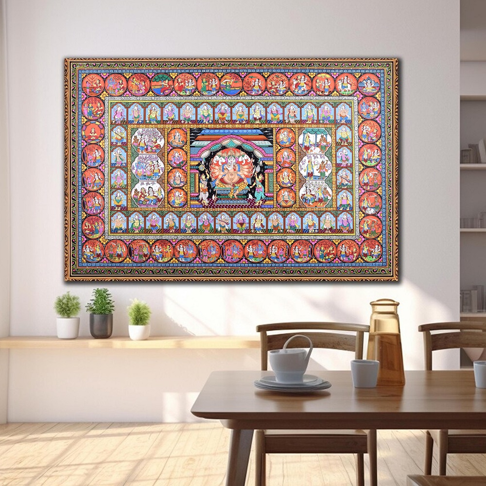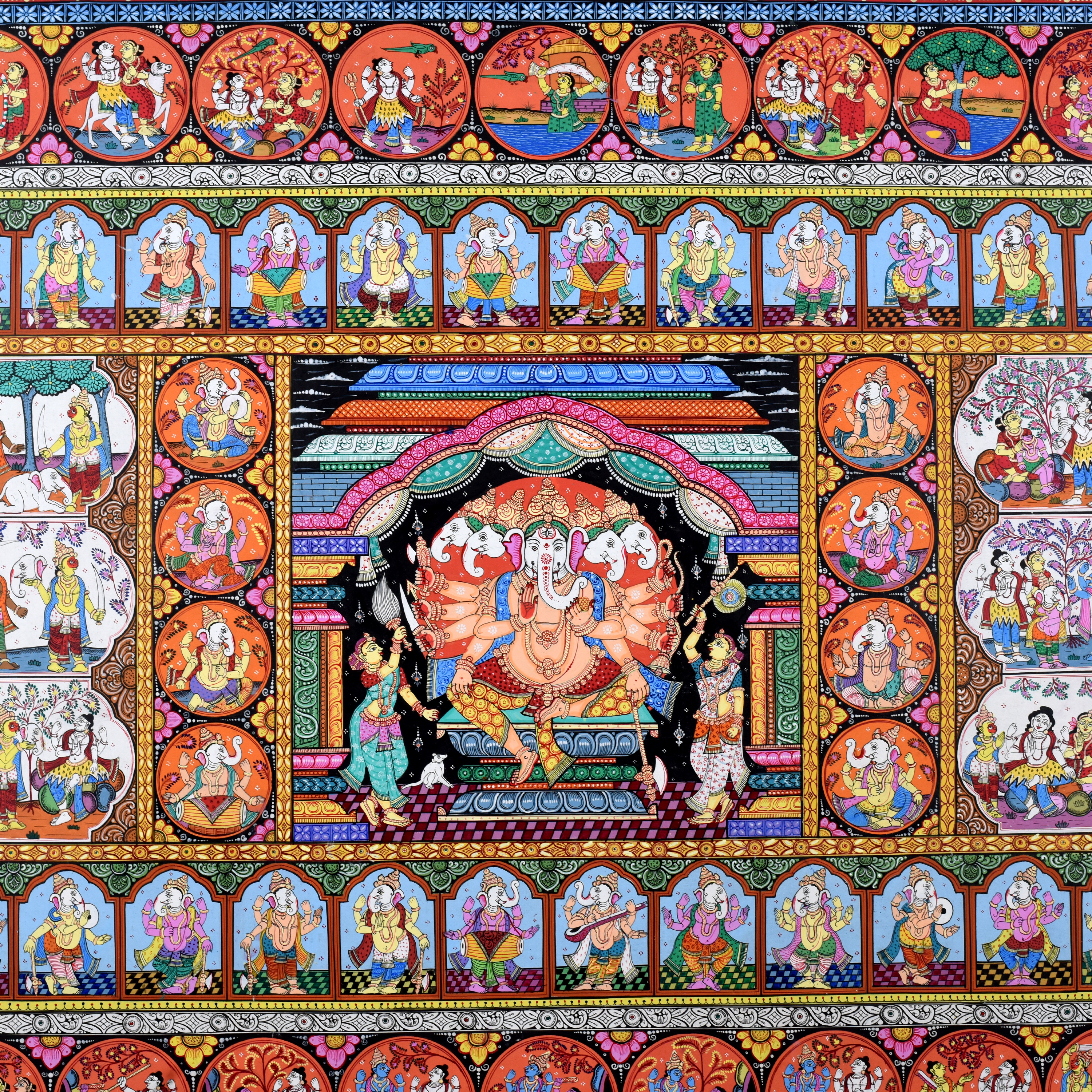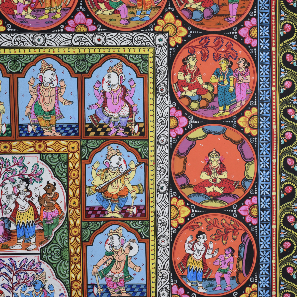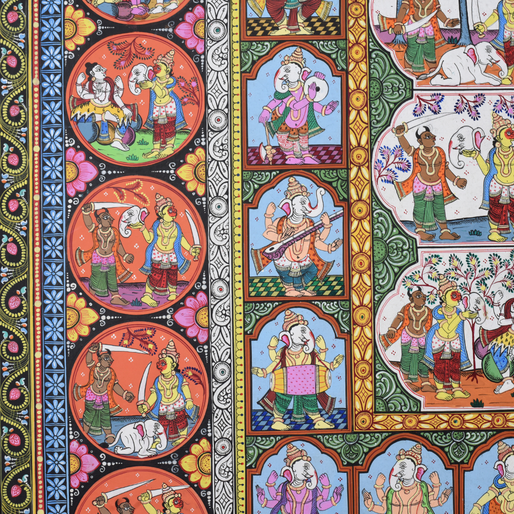 This beautiful Pattachitra painting on cloth paper beautifully showcases the life and various phases of Lord Ganesha, the beloved remover of obstacles and the god of wisdom and prosperity. The painting is highly detailed, vibrant, and tells a comprehensive story of Ganesha's origins, life events, and his role in Hindu mythology. Pattachitra art, native to Odisha, is known for its intricate line work, vibrant colors, and rich cultural depictions, which is clearly evident in this piece. At the center of the painting, Lord Ganesha is prominently featured, surrounded by multiple scenes that highlight the key events in his life. The central depiction shows Ganesha as the remover of obstacles, seated in his traditional posture, symbolizing his significance in both worldly and spiritual matters. His large elephant head, along with his human body, stands as a symbol of wisdom, compassion, and balance between the material and spiritual worlds. The surrounding panels depict different significant phases of Ganesha's life. One of the most well-known stories is his creation by Goddess Parvati, where she made him from clay to guard her while she bathed. Another famous episode shown is Lord Shiva, Ganesha's father, unknowingly beheading him in a fit of rage and later restoring his life by replacing his head with that of an elephant, symbolizing rebirth and divine intervention. The painting also illustrates Ganesha’s childhood, where he is often depicted with his mouse, his vehicle, which is an important aspect of his symbolism. In several panels, Lord Ganesha is shown in different postures and activities, including his victory over various demons, which showcases his divine power and wisdom. The detailed background and borders of the painting are filled with additional elements, such as smaller depictions of other deities, motifs, and floral patterns that add depth to the artwork. The use of rich colors such as red, blue, yellow, and gold brings life to each scene, ensuring that the viewer’s eye is drawn to every detail. In summary, this Pattachitra painting is a visual narrative of Lord Ganesha’s life, showcasing his significance in Hindu mythology. From his miraculous birth to his beheading and rebirth, and his eventual role as the remover of obstacles, this artwork encapsulates the divine qualities and wisdom associated with Ganesha. It serves as a reminder of the harmony between divine intervention, wisdom, and overcoming challenges, making it a valuable piece of spiritual and cultural art.