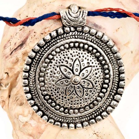 Round Aluminium Metal With Floral And Embossed Border Pendant Necklace