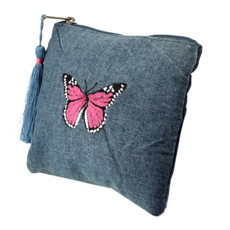Blue Butterfly Embroidered Denim Zip Top Clutch Bag