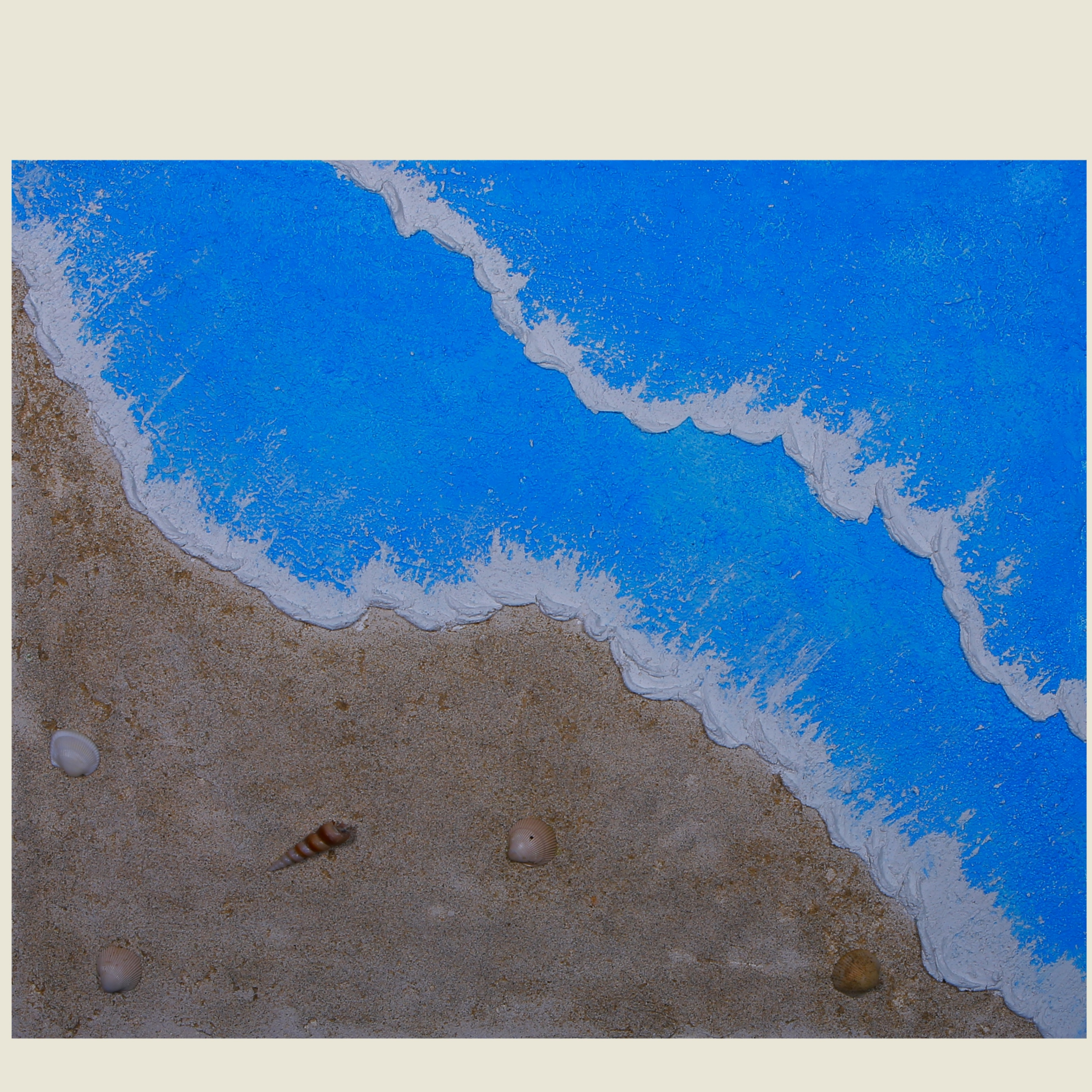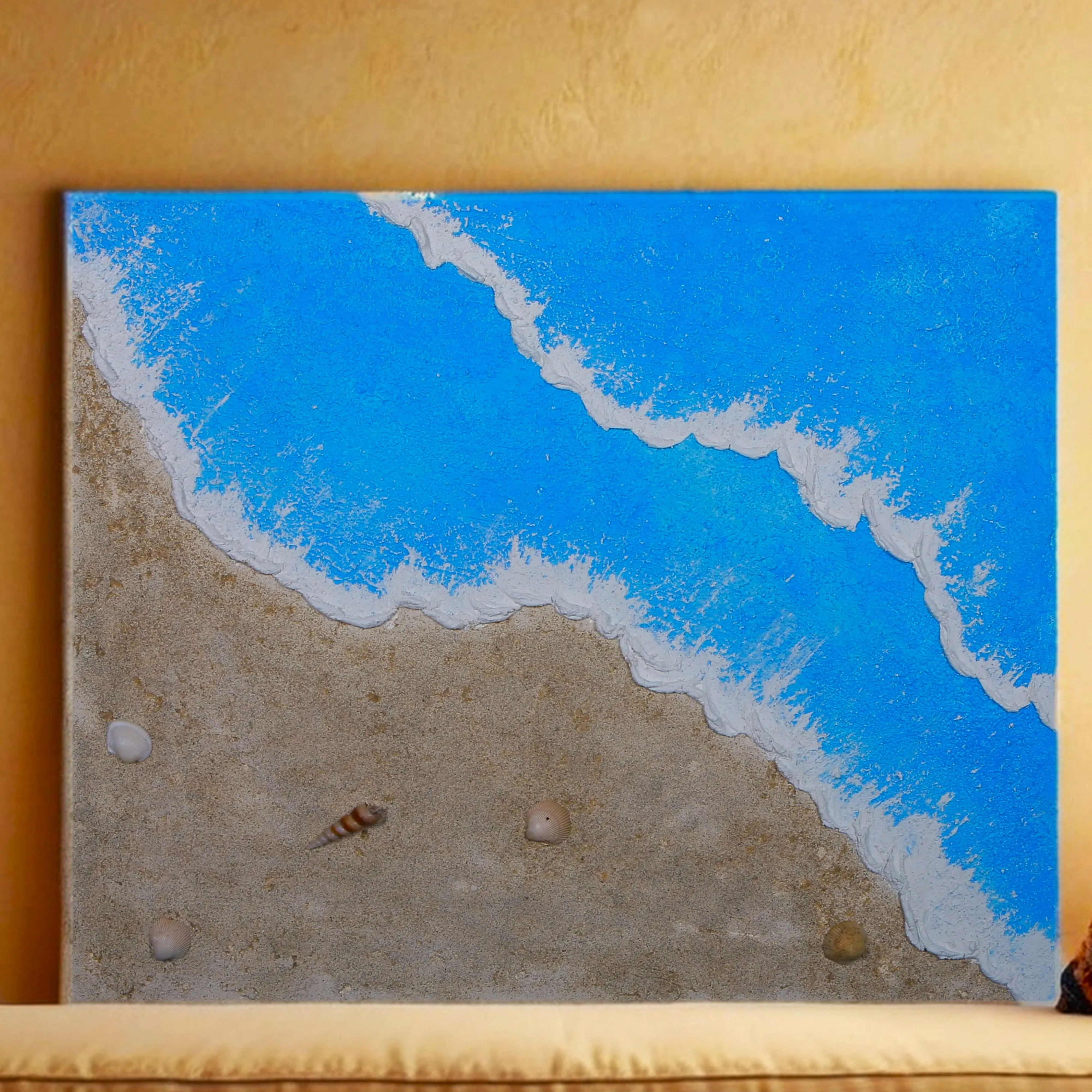 This captivating textured artwork beautifully captures the serene meeting of sea and shore, evoking the peaceful essence of a beachside escape. Crafted with meticulous attention to detail, the piece showcases vibrant azure waves cresting into delicate white foam, gently lapping onto a sandy shore. What makes this artwork truly remarkable is the use of 'real sea shells' and 'genuine sand', lending it a lifelike, tactile quality that draws the viewer in. The three-dimensional texture of the waves, paired with the natural grain of the sand and the organic forms of the shells, creates an immersive, almost tangible seascape. It's not just a painting—it's a sensory experience, blending artistry with nature in a harmonious, visually soothing display.