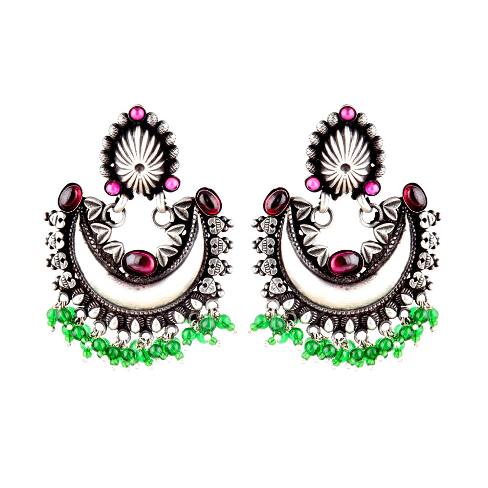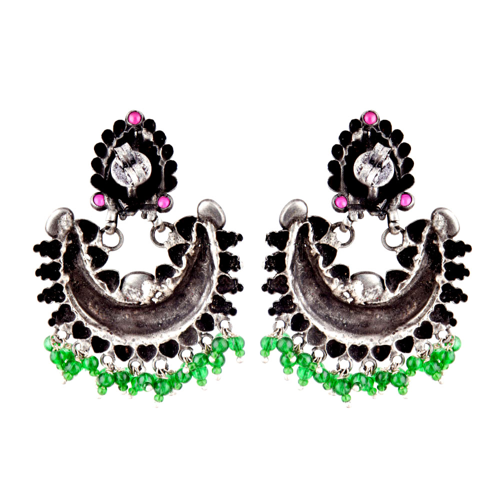 Chandbali 92.5 sterling silver earrings with lovely floral pattern and heart motifs on the bali . Pops of color added to the earring by attaching pink jade quartz green peridot beads on the bottom. Wear it with your favorite green or pink chiffon sari, lehenga or suit. Lovely gift for your near ad dear ones.