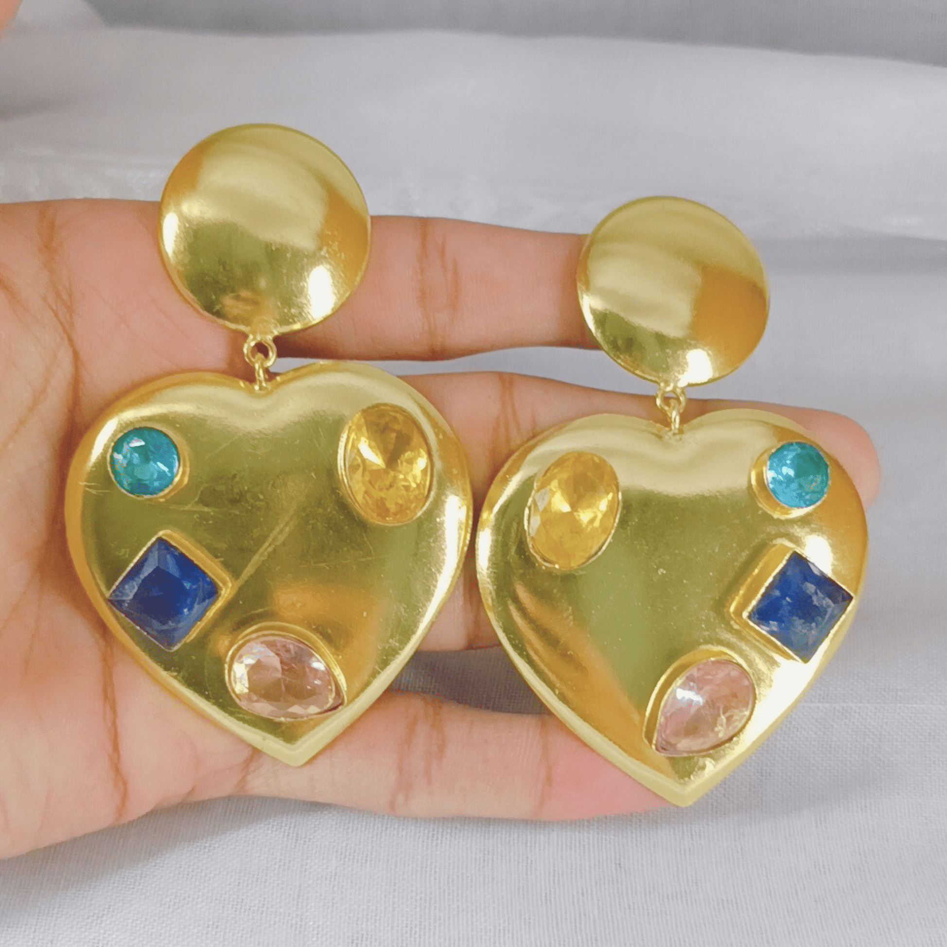 These Colorful CZ Stone Earrings are a celebration of bold color, handcrafted detail, and expressive design. Made from solid brass and adorned with a spectrum of sparkling cubic zirconia stones, each earring showcases a lively arrangement that catches the light from every angle. The large 3.14-inch silhouette adds dramatic elegance, making this pair perfect for women who love statement jewelry with artistic, handmade charm. Radiant, vibrant, and full of personality—these earrings elevate any look.