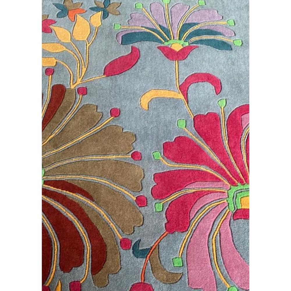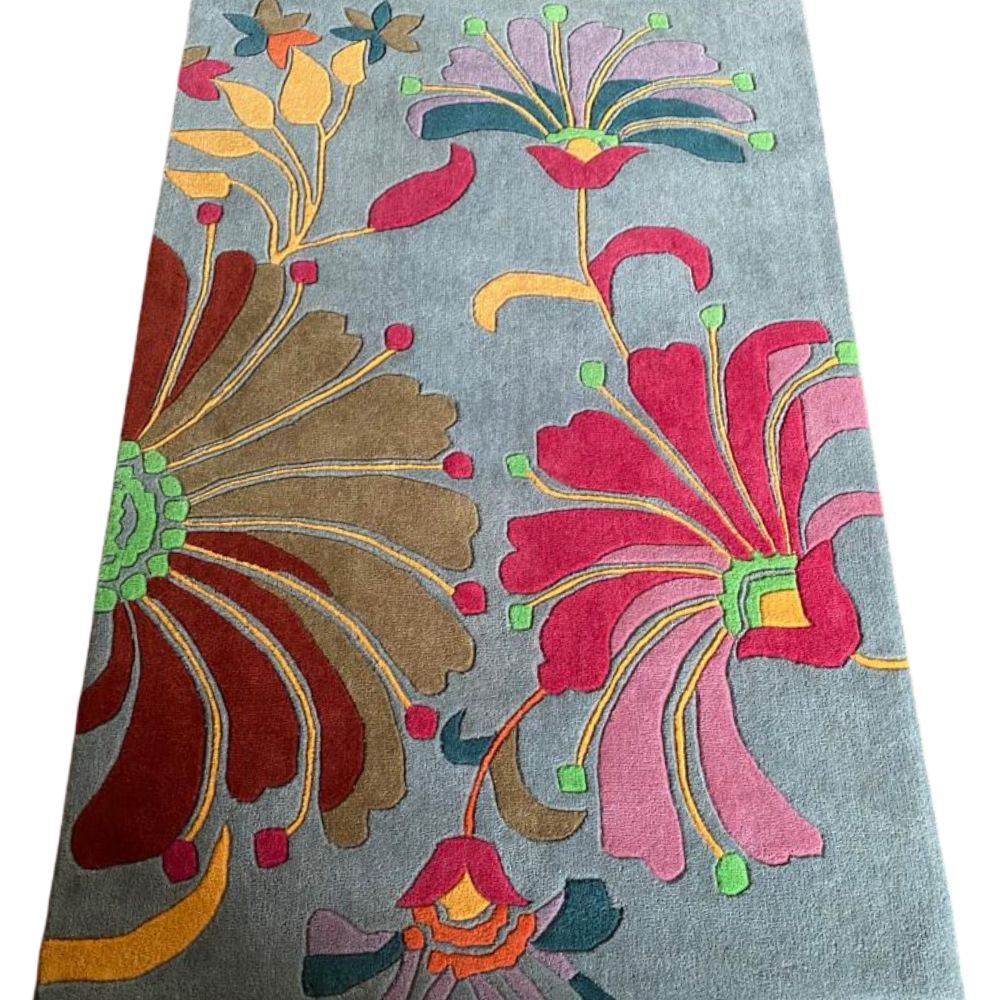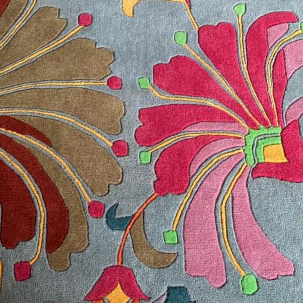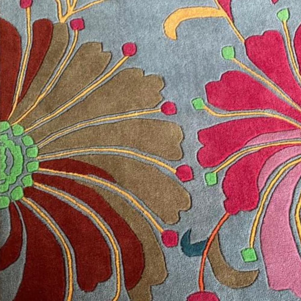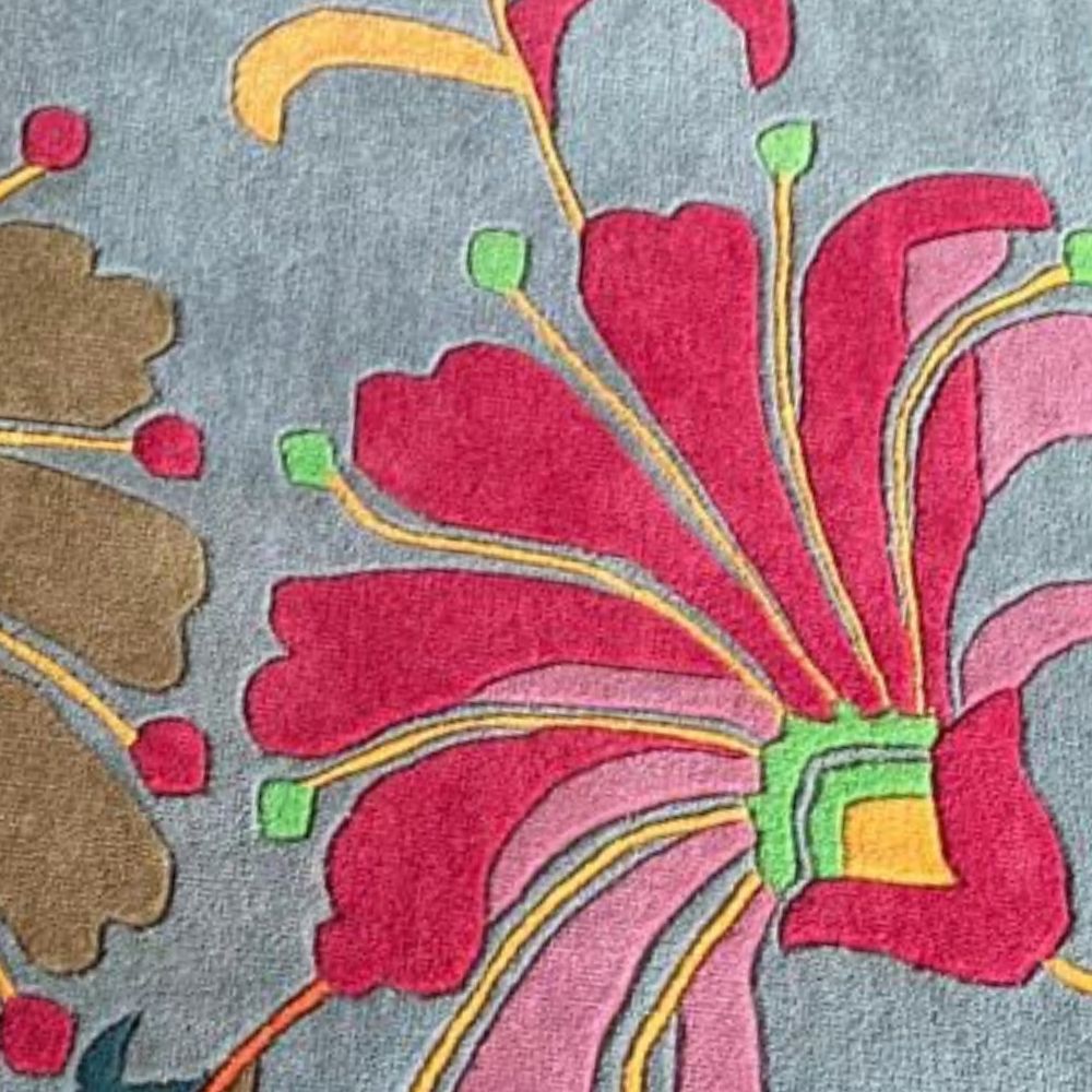 Transform your living space with this hand-tufted wool floral rug, a true statement piece that merges artistry with functionality. Its bold botanical motifs, set against a serene blue-grey background, bring a refreshing balance of vibrancy and sophistication to any room. Designed and crafted by skilled artisans, this rug embodies both luxury and durability, making it ideal for modern homes with a creative edge. Color Palette This rug showcases a striking mix of colors that create both harmony and contrast: Blue-Grey Base: A calming backdrop that grounds the vibrant floral elements. Crimson Red & Hot Pink: Bold flower petals that create a lively focal point. Burnt Orange: Warm undertones adding earthy richness. Mustard Yellow: Bright highlights that inject warmth and cheerfulness. Olive & Forest Green: Natural leafy details providing freshness. Lavender & Lilac: Soft pastel petals adding a dreamy, whimsical effect. Deep Teal Accents: Subtle cool tones enhancing balance. Together, these shades form a modern botanical palette that works beautifully in eclectic, contemporary, and artistic interiors. Design & Pattern Theme: Oversized floral blossoms with flowing stems and leaves. Pattern: Bold, layered.