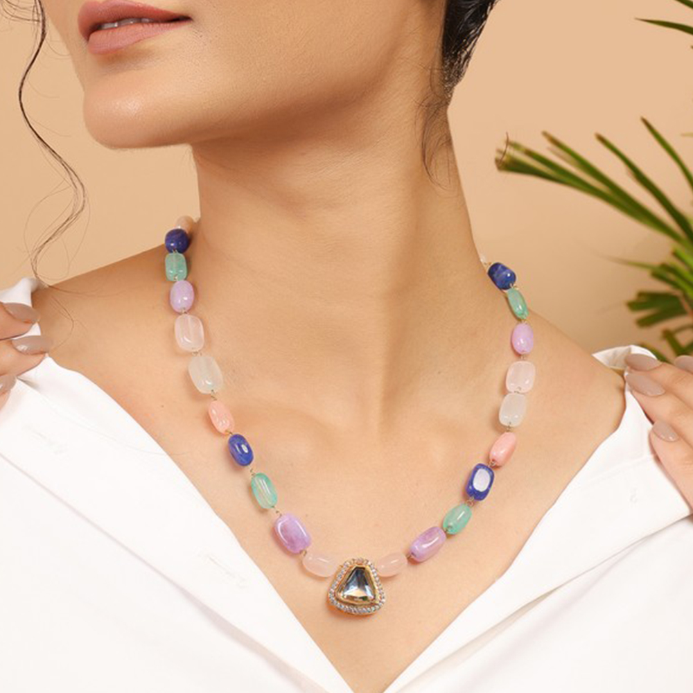 The Colorful Pastel Beaded Necklace with Triangular Kundan Pendant is a refreshing blend of soft hues and traditional detailing. Crafted in brass with a luminous golden finish, this 20-inch necklace features delicate pastel beads that add a light, graceful rhythm to the design. At the center rests a triangular kundan pendant, offering geometric structure balanced by classic Indian artistry. The result is a necklace that feels youthful, festive, and beautifully refined.